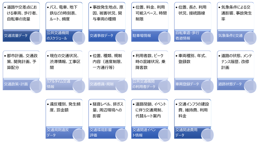 交通データは、車両流量、交通事故、公共交通のスケジュール、駐車場情報など、多岐にわたる情報をカバーしています。