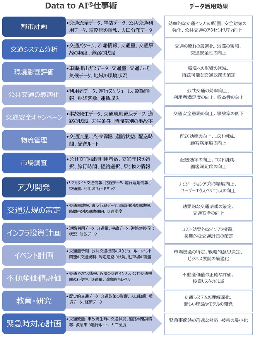 交通分野のオープンデータを活用した仕事術のサンプルを、各項目で使用される具体的なデータとその効果とともに紹介します。