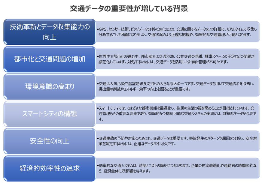 これらの背景により、交通データは都市計画、環境保全、経済活動、安全など、さまざまな分野での意思決定において重要な役割を果たしています。また、これらのデータを活用することで、より快適で持続可能な交通システムの構築に貢献しています。