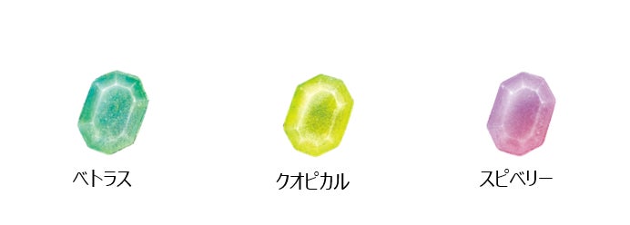 それぞれの飴粒にはオリジナルの名前が付けられており、ベリルをイメージした「べトラス」はシトラス系の爽やかで神秘的な味わい、クオーツをイメージした「クオピカル」はトロピカル系で心地よく陽気な甘み、スピネルは「スピベリー」と名付け、甘酸っぱく妖艶なベリー系の味を表現しました。