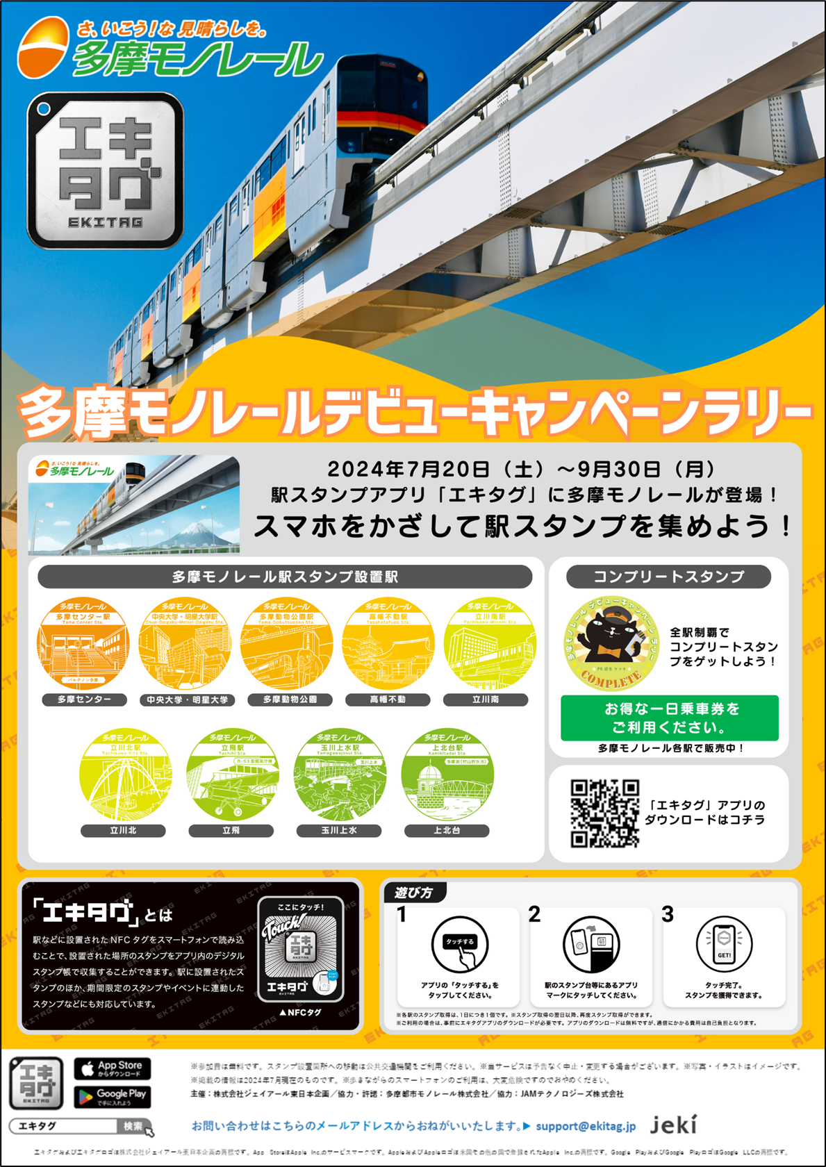 ◎株式会社ジェイアール東日本企画が提供する駅スタンプアプリ「エキタグ」は、2024年7月20日(土)より東京の多摩地域を走る「多摩モノレール」にてデジタル駅スタンプのサービス提供を開始し、「デビューキャンペーンラリー」を開催いたします。オリジナルスタンプを求めて、ぜひこの機会に多摩の旅をお楽しみください!