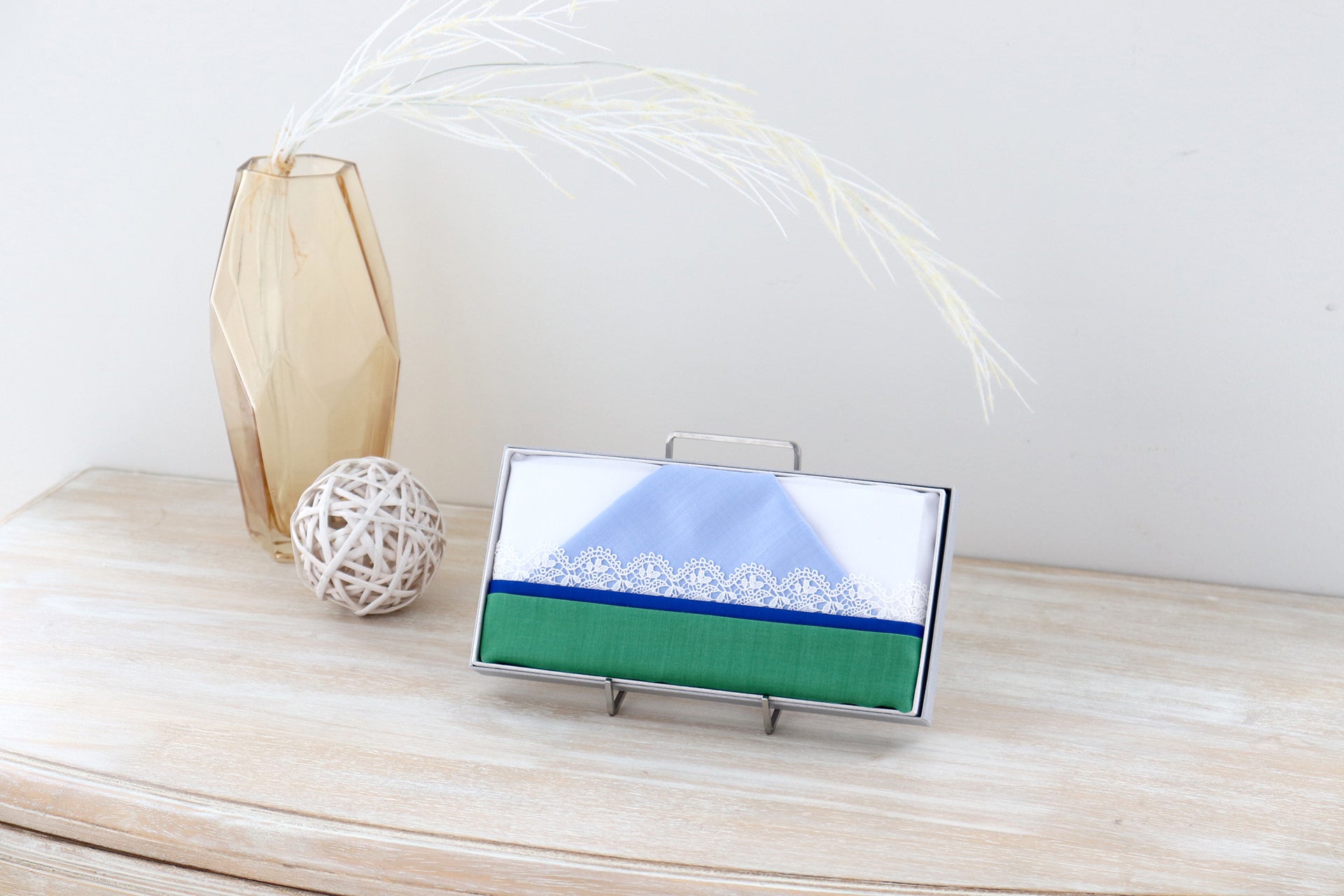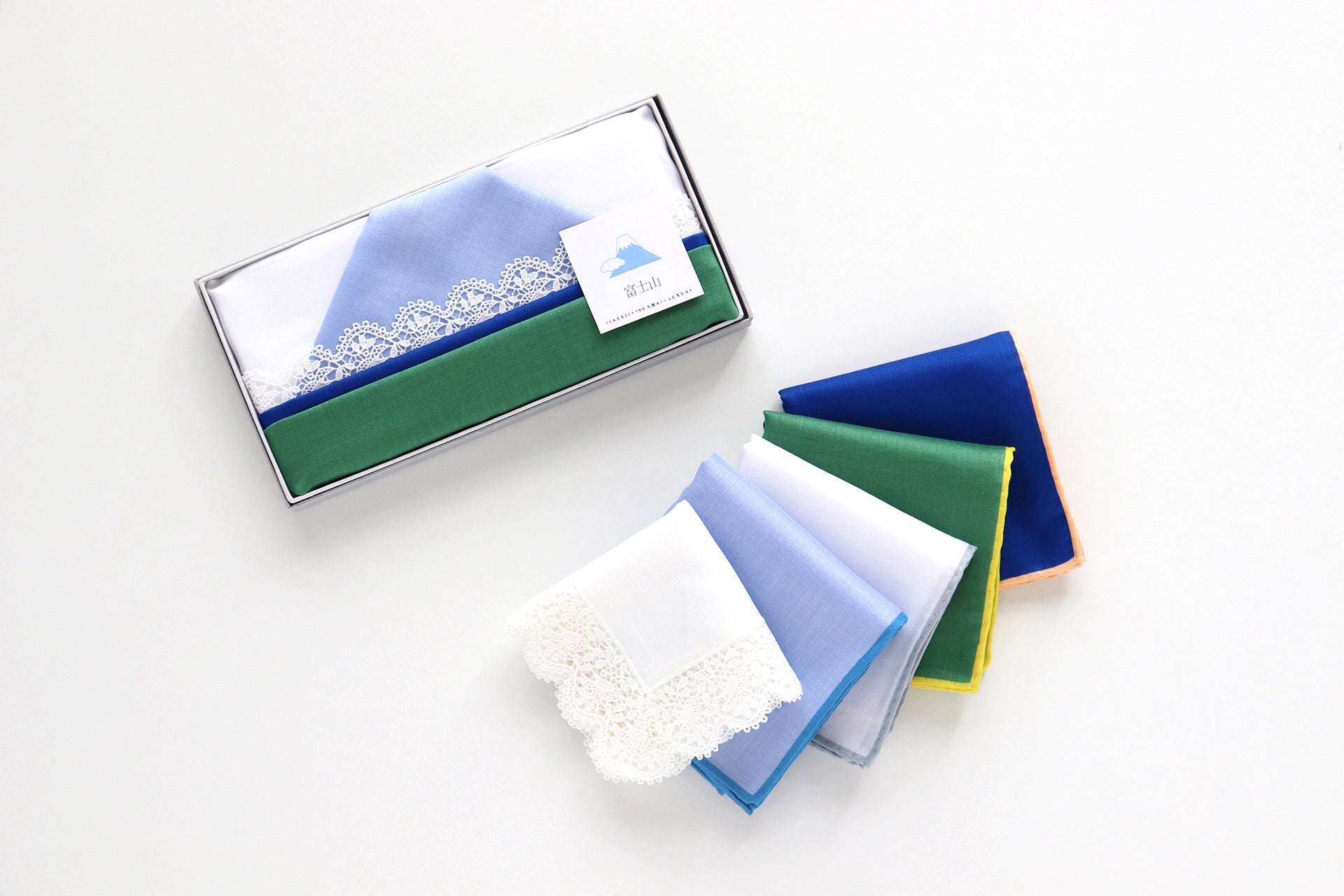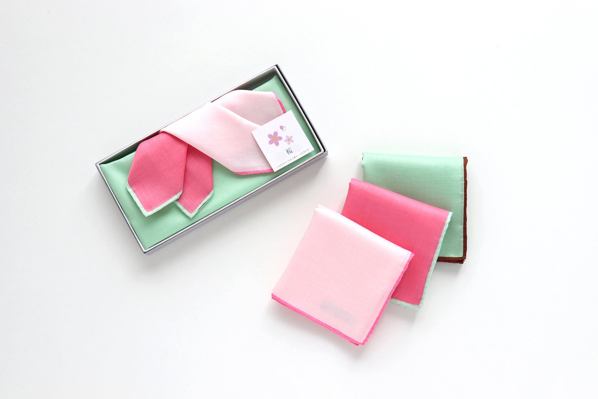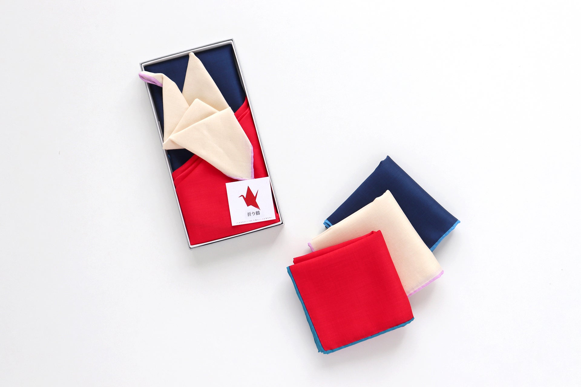 折り紙と同じ技法で美しく折り上げました。3枚のハンカチが他の色と組み合わさり、一つの美しいセットとして箱に収められています。