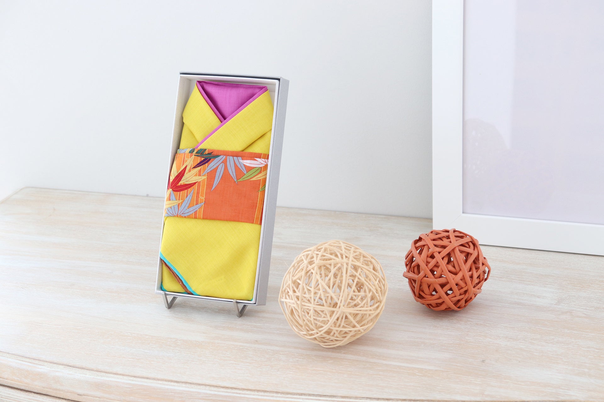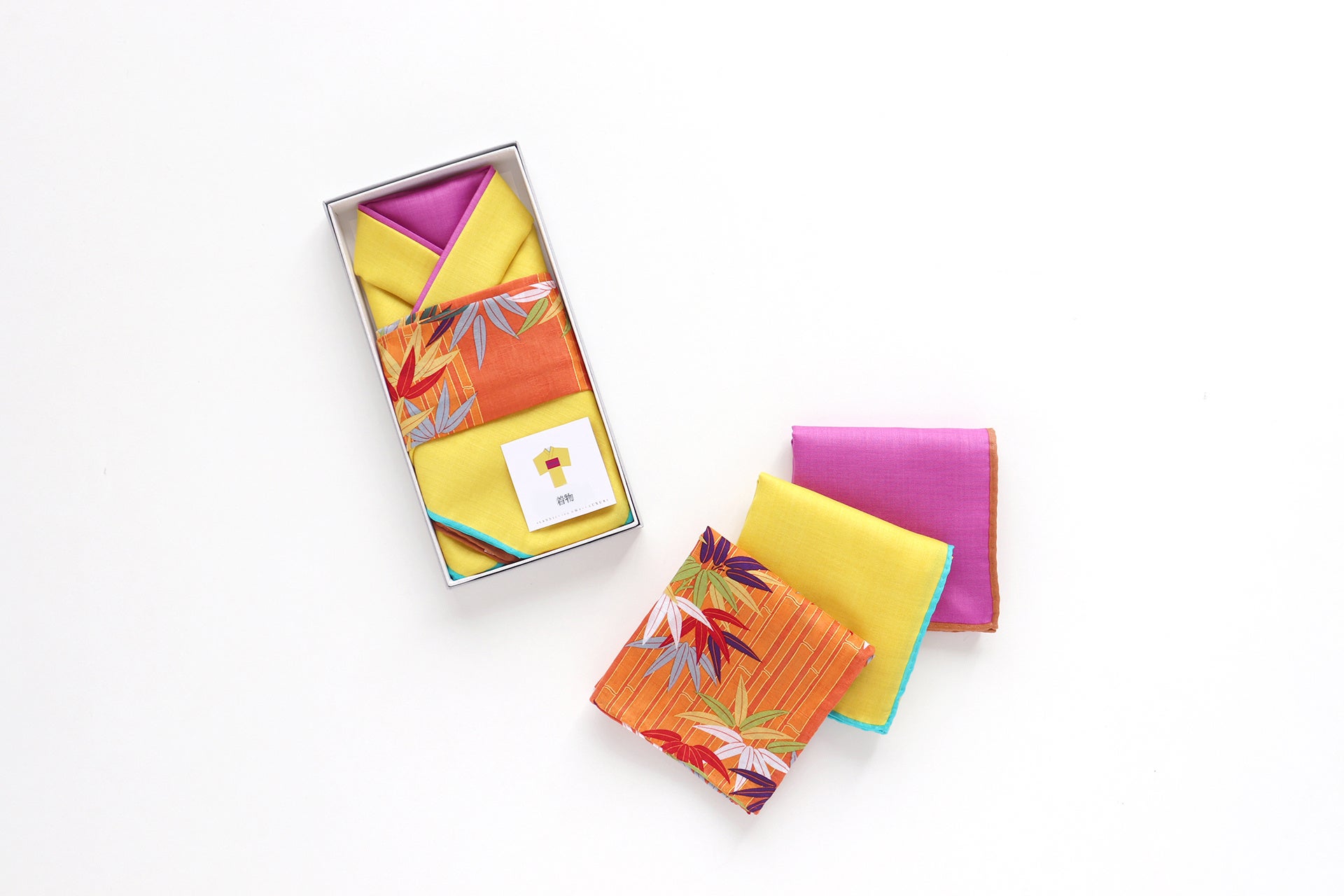 日本の伝統的な民族衣装着物。「SICカラーシリーズ」108色のハンカチの中から厳選した2色を組み合わせました。さらに、竹や笹をモチーフにした和柄のハンカチを帯に見立て、着物の艶やかなイメージを箱の中で表現しています。ハンカチ3枚で出来ています。