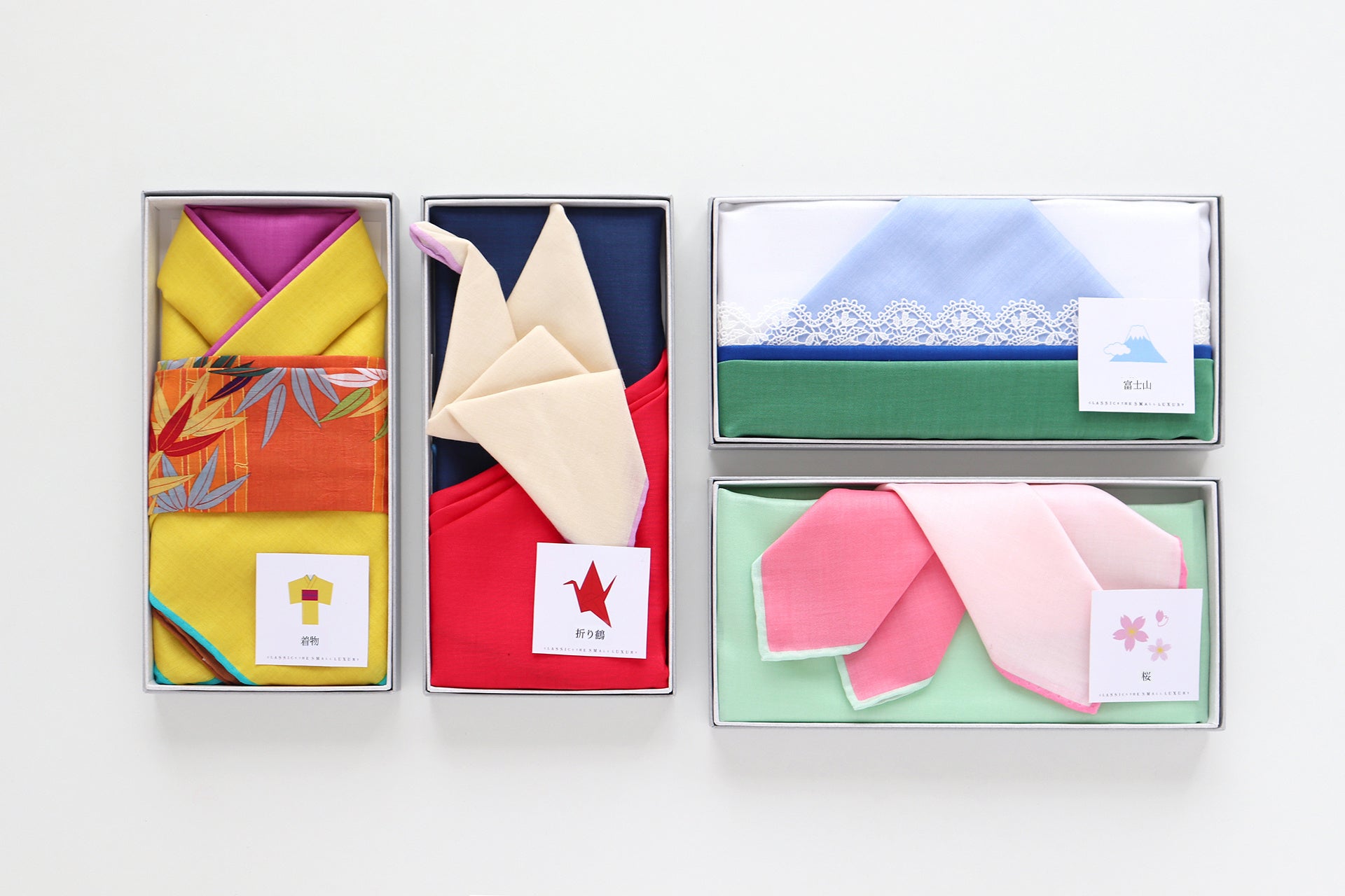 ハンカチの柄そのものでなく、ハンカチを折ったり重ねたりして組み合わせることで何か表現ができるのではないかと考え「折り紙アートハンカチーフ」が誕生しました。ギフトの箱を開ける瞬間のわくわく感や、開けた時の驚きを感じて欲しいと思っています。ハンカチに馴染みのない海外の方にも喜んでいただきたいと思い、今回は日本らしさを表現できるモチーフ「着物」「鶴」「富士山」「桜の」4種類を選び、まるで折り紙アートのようにボックスに入れました。インテリアとして飾っていただいたり、海外の方への贈り物にもおすすめです。