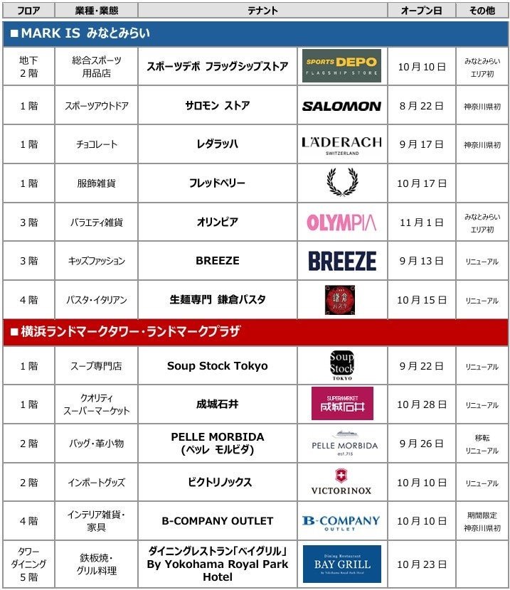 MARK IS みなとみらい(神奈川県横浜市/運営:三菱地所プロパティマネジメント株式会社)と、横浜ランドマークタワー・ランドマークプラザ (同/運営:同)は、2025年春から、MARK IS みなとみらいの大規模リニューアルや、ランドマークプラザの横浜食文化を発信する新拠点「ヨコバル」オープンなど、ファッション、インテリア、雑貨、飲食店舗の約30店舗がオープン&リニューアルオープンいたしました。この秋さらに、神奈川県初出店、みなとみらいエリア初出店を含む合計13店舗(新店舗7店舗・リニューアル6店舗)がオープンいたします。