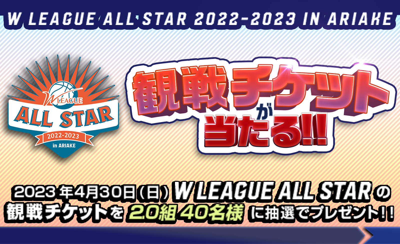 本キャンペーンでは2023年4月30日(日)に開催される「W LEAGUE ALL STAR 2022-2023 IN 有明」の観戦ペアチケット(自由席)を抽選で20組40名様にプレゼントします。Wコレにログインしていただければ、誰でも無料で応募可能となりますので、多くのお客様のご参加をお待ちしております。