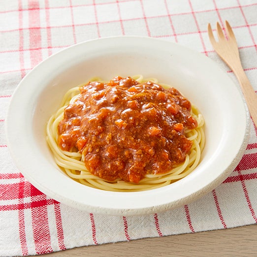 「やさいとなかよしPlus ミートソース」とメニュー例(ミートソースパスタ)