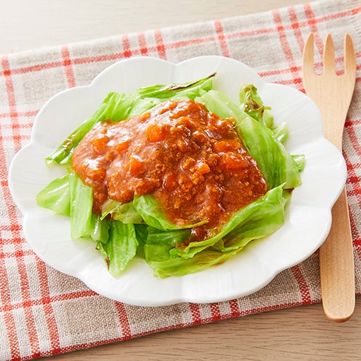 「ミートソース」を使用したメニュー例 ㊧ミートドリア、㊨ゆで野菜がけ(キャベツ)
