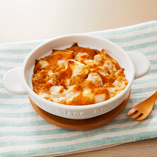 「鮭とかぼちゃの豆乳クリーミィソース」を使用したメニュー例 ㊧パングラタン、㊨ゆで野菜がけ(ほうれん草)
