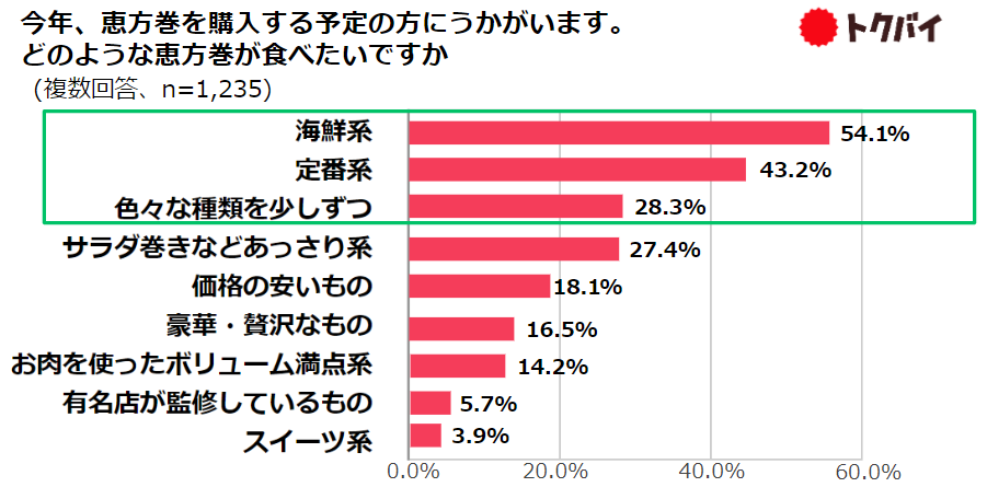 「海鮮系」恵方巻が「定番系」を上回り人気トップ、「色々な種類を少しずつ」食べたいという人が約3割