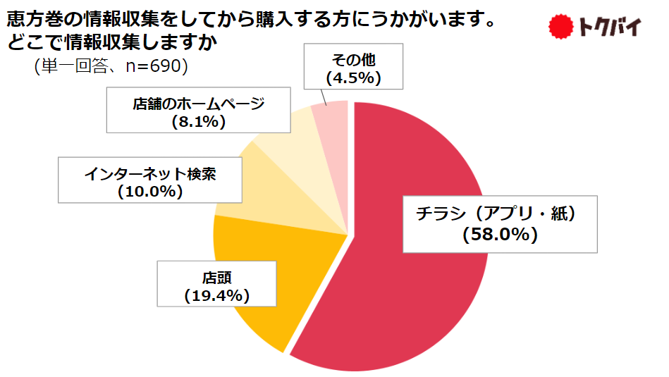 今年恵方巻を購入する予定の人に、恵方巻を購入するタイミングについてたずねたところ、「事前に予約する」人が35.9%、「当日購入する」人が64.1%でした。また、購入前に恵方巻の情報収集をしてから予約・購入すると回答した人の約6割が「チラシ(紙・アプリ)」で情報収集をしていることがわかりました。