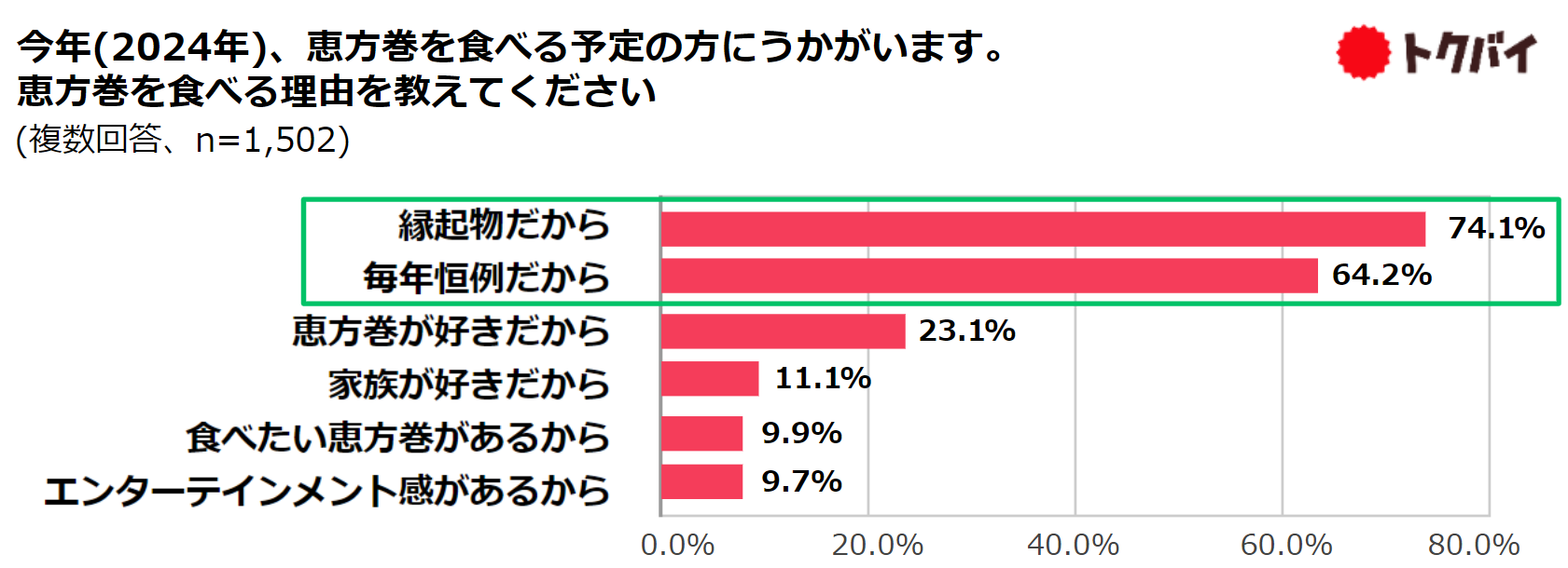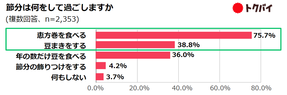 節分に「恵方巻を食べる」人は7割以上、「豆まきをする」人の約2倍、主な理由は「縁起物だから」74.1%、「毎年恒例だから」64.2%