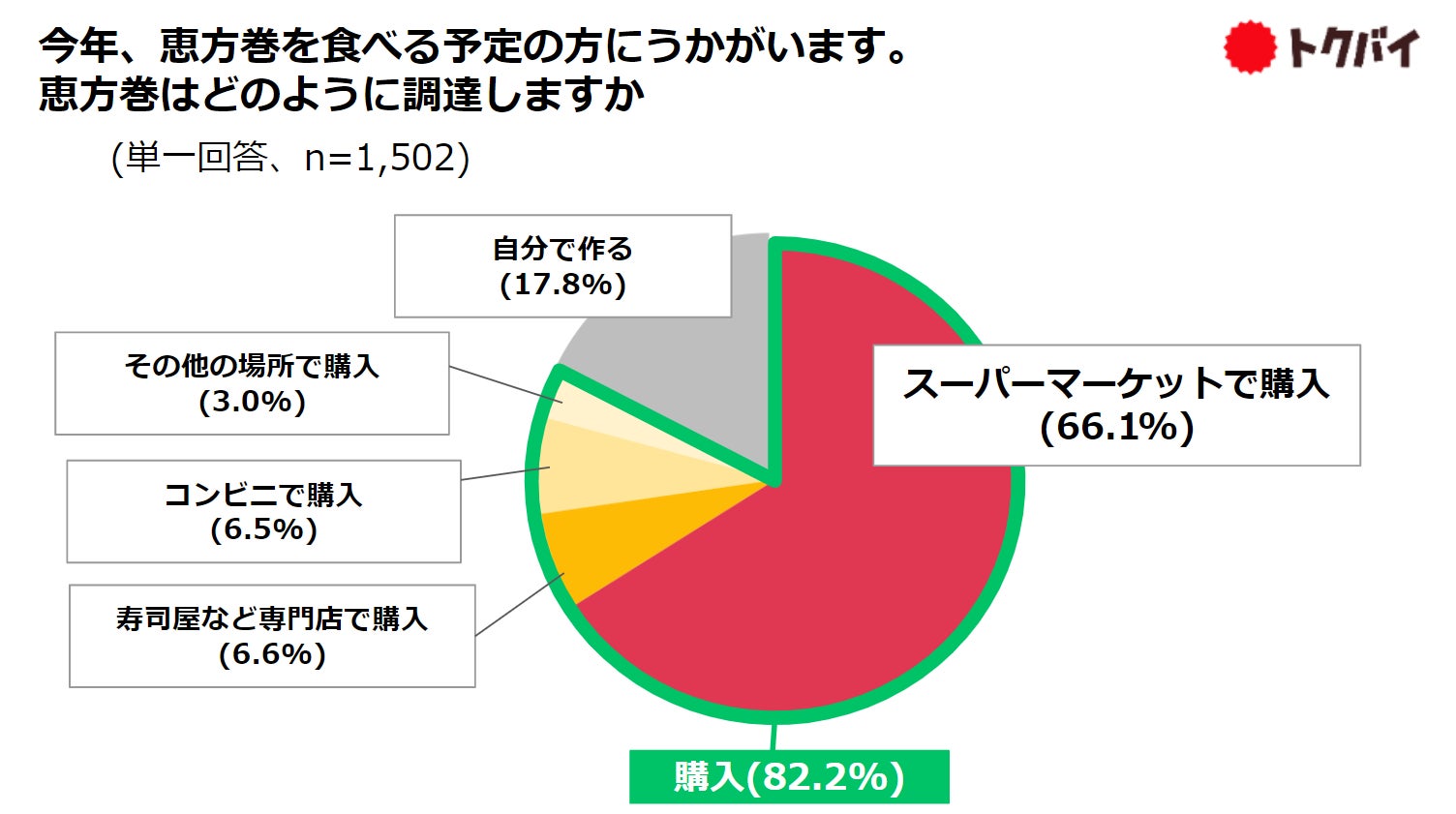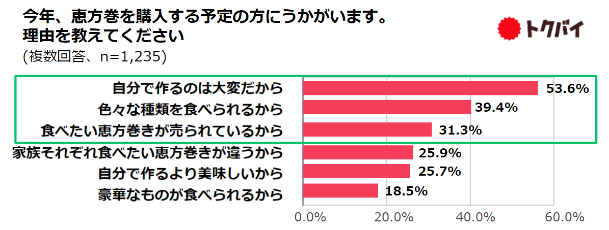 恵方巻を「購入する」人は8割以上、主な購入先は「スーパーマーケット」。理由は「自分で作るのは大変だから」53.6%、「色々な種類を食べられるから」39.4%、「食べたい恵方巻きが売られているから」31.3%