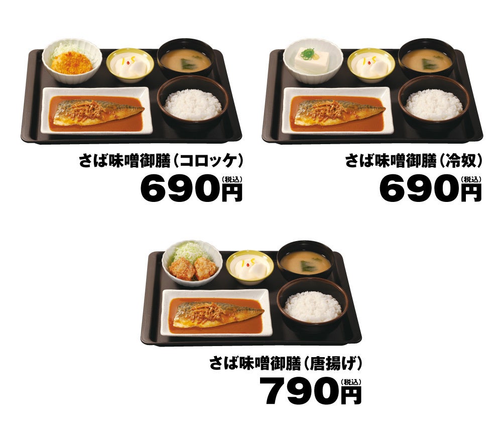 | 商品名 さば味噌煮御膳(コロッケ1個) 690円 さば味噌煮御膳(冷奴) 690円 さば味噌煮御膳(唐揚げ2個) 790円 ※お持ち帰りいただけます。お持ち帰りのみそ汁は、別途60円でお買い求めいただけます。 ※全て税込価格です。また、店内・お持ち帰りの税込価格は同一です。 発売日 2022年6月29日(水)午後3時 対象店舗 一部店舗を除く全国の松のや・松乃家 ※「松屋×松のや」の複合型店舗での販売はいたしません。 |