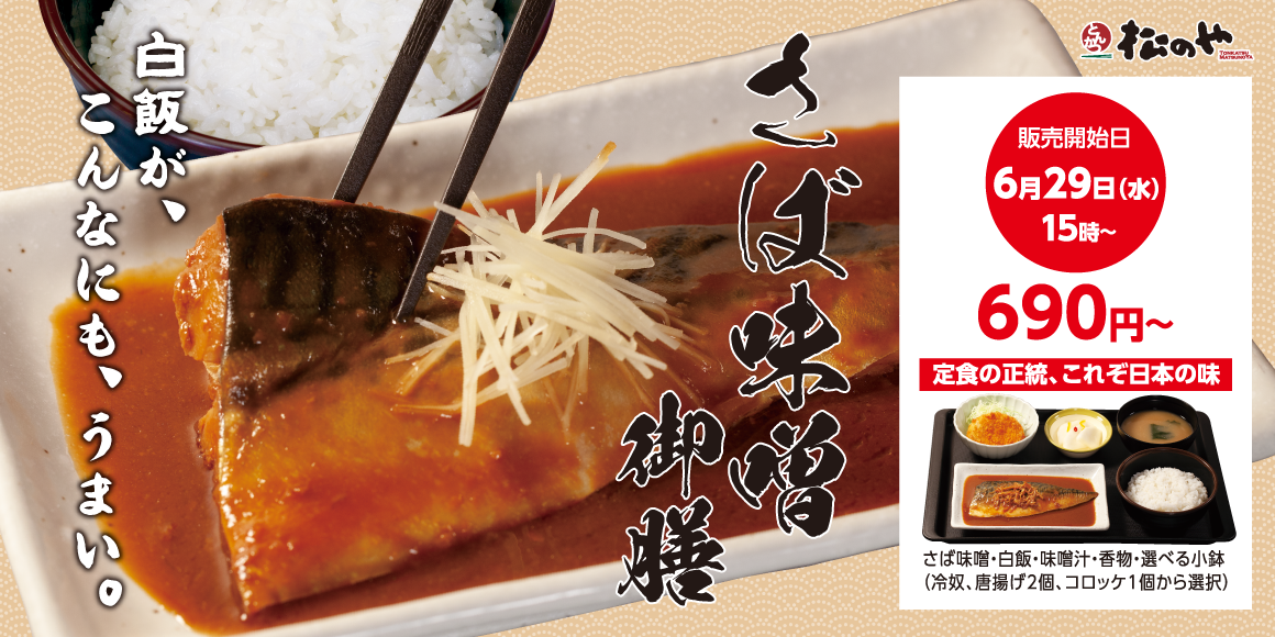 株式会社松屋フーズ(本社:東京都武蔵野市、代表取締役社長:瓦葺 一利)では、とんかつ専門店の「松のや・松乃家」におきまして、2022年6月29日(水)午後3時より、「さば味噌御膳」を発売いたします。