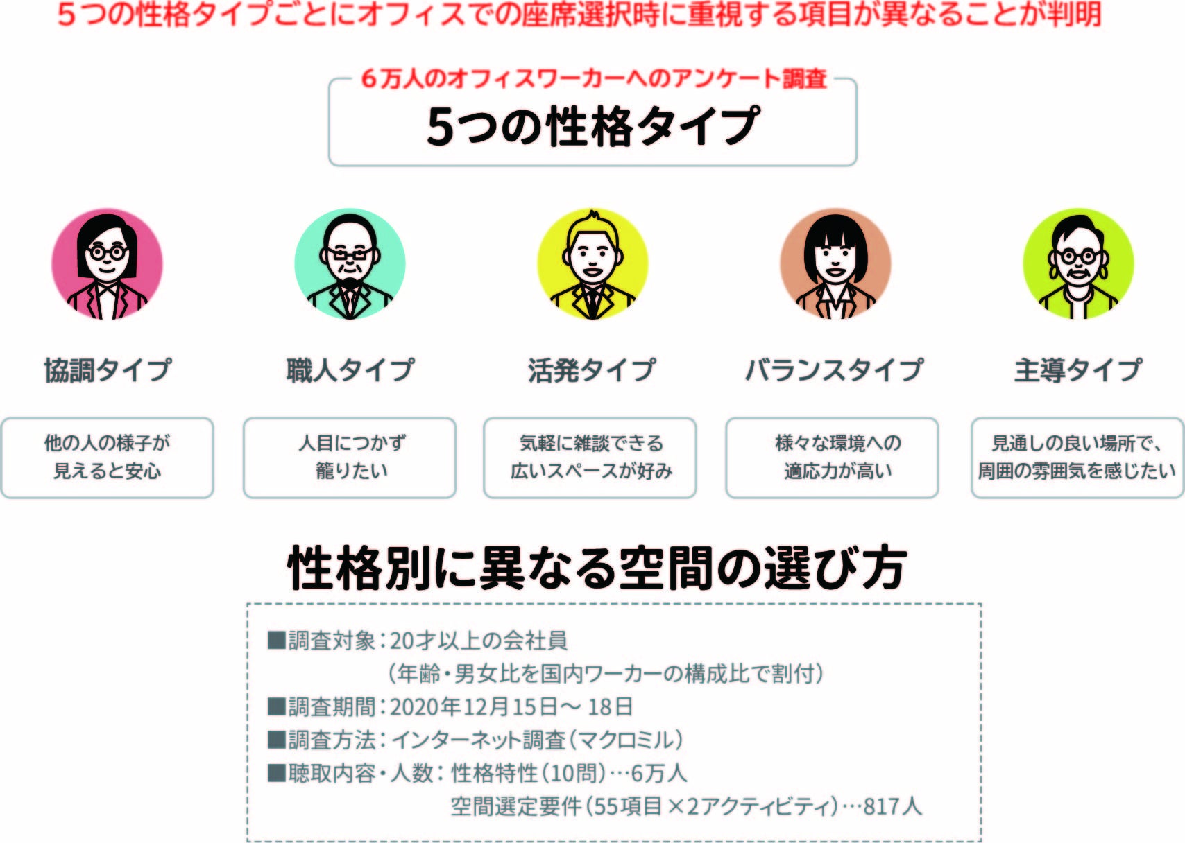 当社および竹中工務店では、これまでに数多くのABWオフィスを設計してまいりました。ABWオフィスでの調査により、同じ業務を行う場合でも、ワーカーごとに選ぶ席が異なることが明らかとなっています。ワーカーが好みのオフィス空間や環境を選択できることが、生産性向上に資する最適なABWオフィスとして望まれます。そこで両社は、「ワーカーの性格タイプが座席選択に影響している」という仮説を立て、オフィスワーカー6万人を対象としたWebアンケートを実施しました。その結果、ワーカーの性格タイプを特徴的な5つのグループに分類できることが明らかになりました。