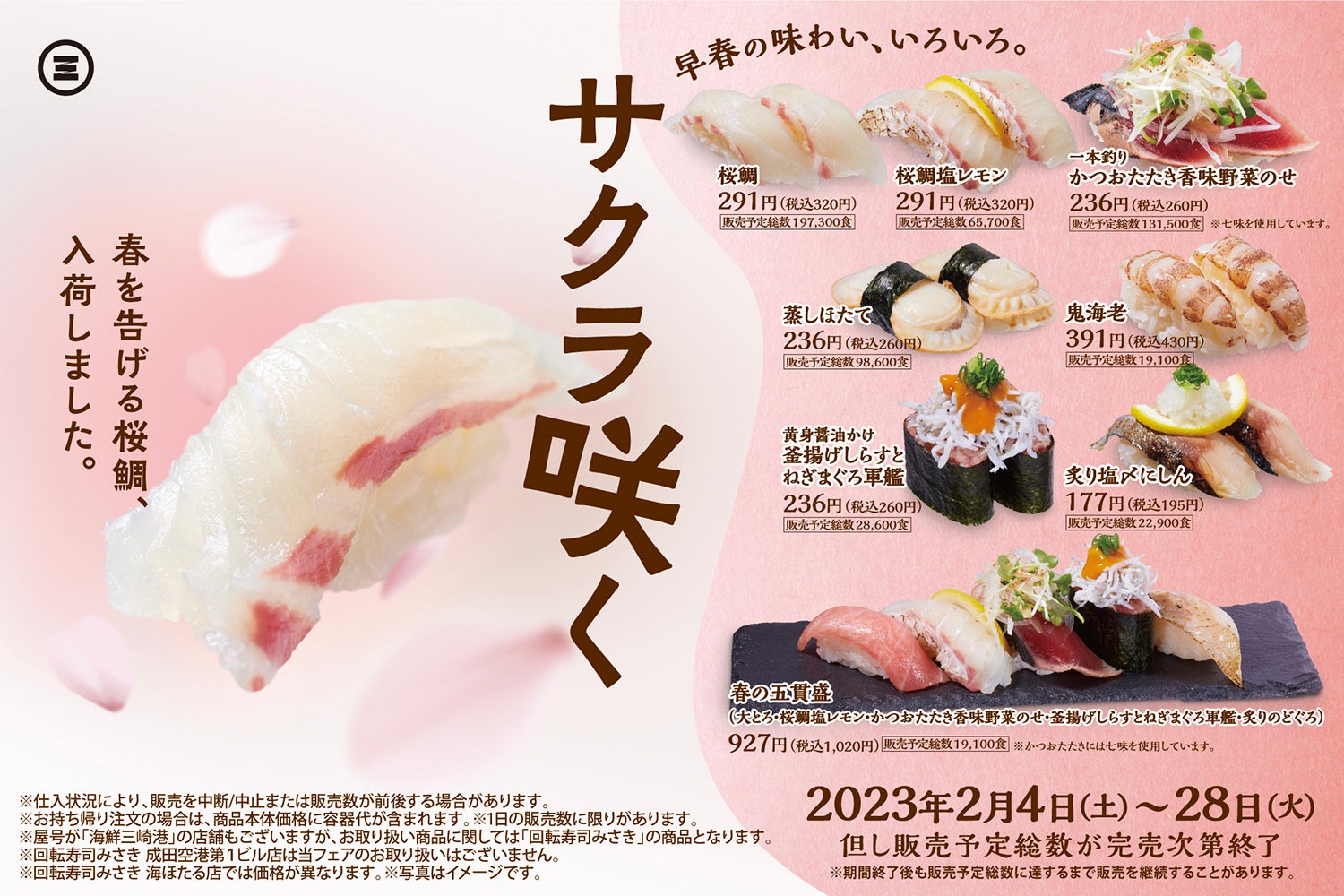 株式会社 京樽(本社:東京都中央区、代表取締役社長:堀江 陽)が展開する「回転寿司みさき旧:海鮮三崎港)」では、桜が咲く季節に水揚げされる「桜鯛」など、春を感じる期間限定商品を2月4日(土)より販売いたします。