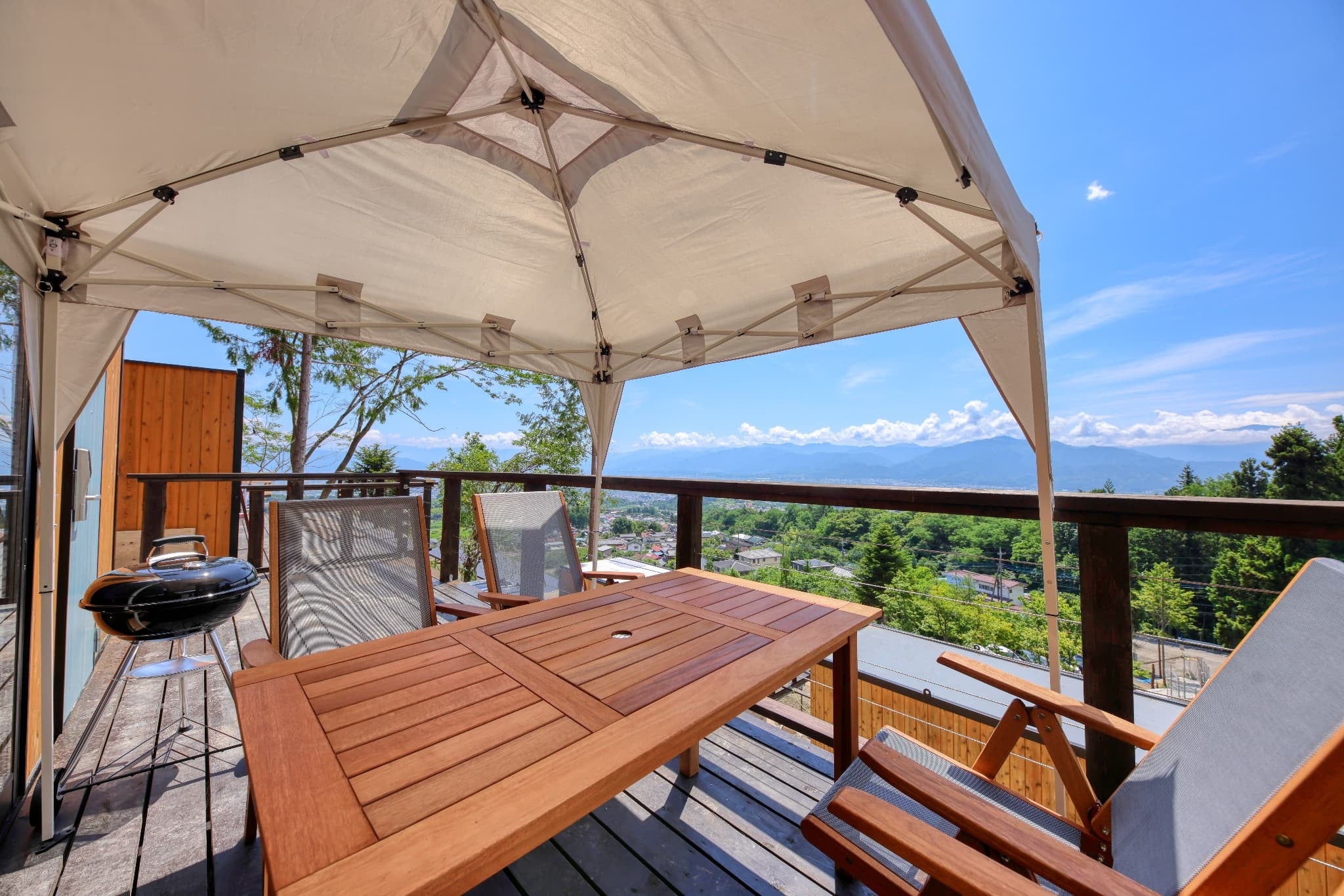 都心から車で95分。ユネスコエコパーク内の自然豊かな山梨県南アルプス市の麓に広がる美しい甲府盆地と富士山を望む絶景スポットで、地元の食材をたっぷりと使用した贅沢BBQやコース料理をご堪能いただいております。