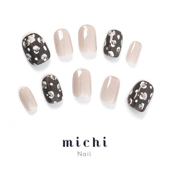 肌なじみの良いくすみピンクカラーと大人っぽくまとまったレオパードネイル。ブラウンカラーにホワイトで描かれたレオパードはシックで上品な雰囲気です。程よく輝くラメと全体的なバランスが美しいネイルチップです。
