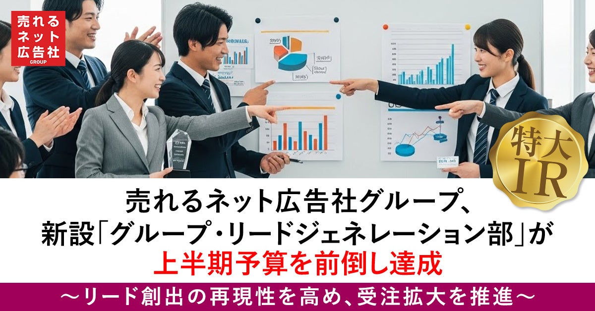 売れるネット広告社グループ株式会社(本社:福岡県福岡市、代表取締役社長CEO:加藤公一レオ、東証グロース市場:証券コード9235、以下 売れるネット広告社グループ)の連結子会社である売れるネット広告社株式会社は、2025年10月21日にお知らせいたしました、新設したグループ横断の新規リード創出専門部署「グループ・リードジェネレーション部」が、想定を大きく上回るペースで成果を上げ、上半期予算を前倒しで達成したことにより、上半期見込みを上方修正することをお知らせいたします。