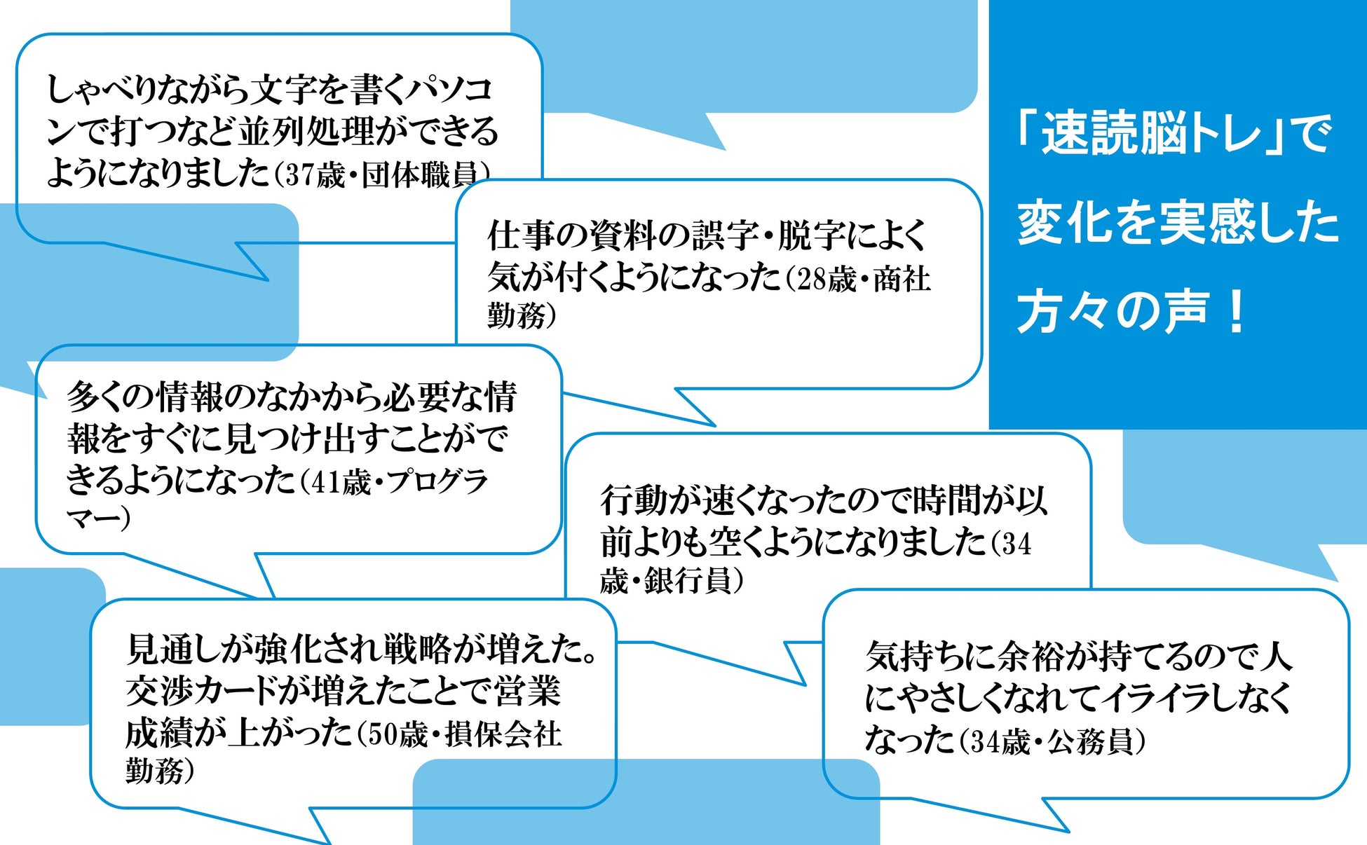 「速読脳トレ」は、官公庁のほか、一部上場企業、ベンチャー企業といったさまざまな団体や企業でも取り入れられており、実践している方々からは「行動が速くなり、時間に余裕ができるようになった」「マルチタスクが得意になった」「資料の間違いなどに気づきやすくなった」といった声が寄せられています。