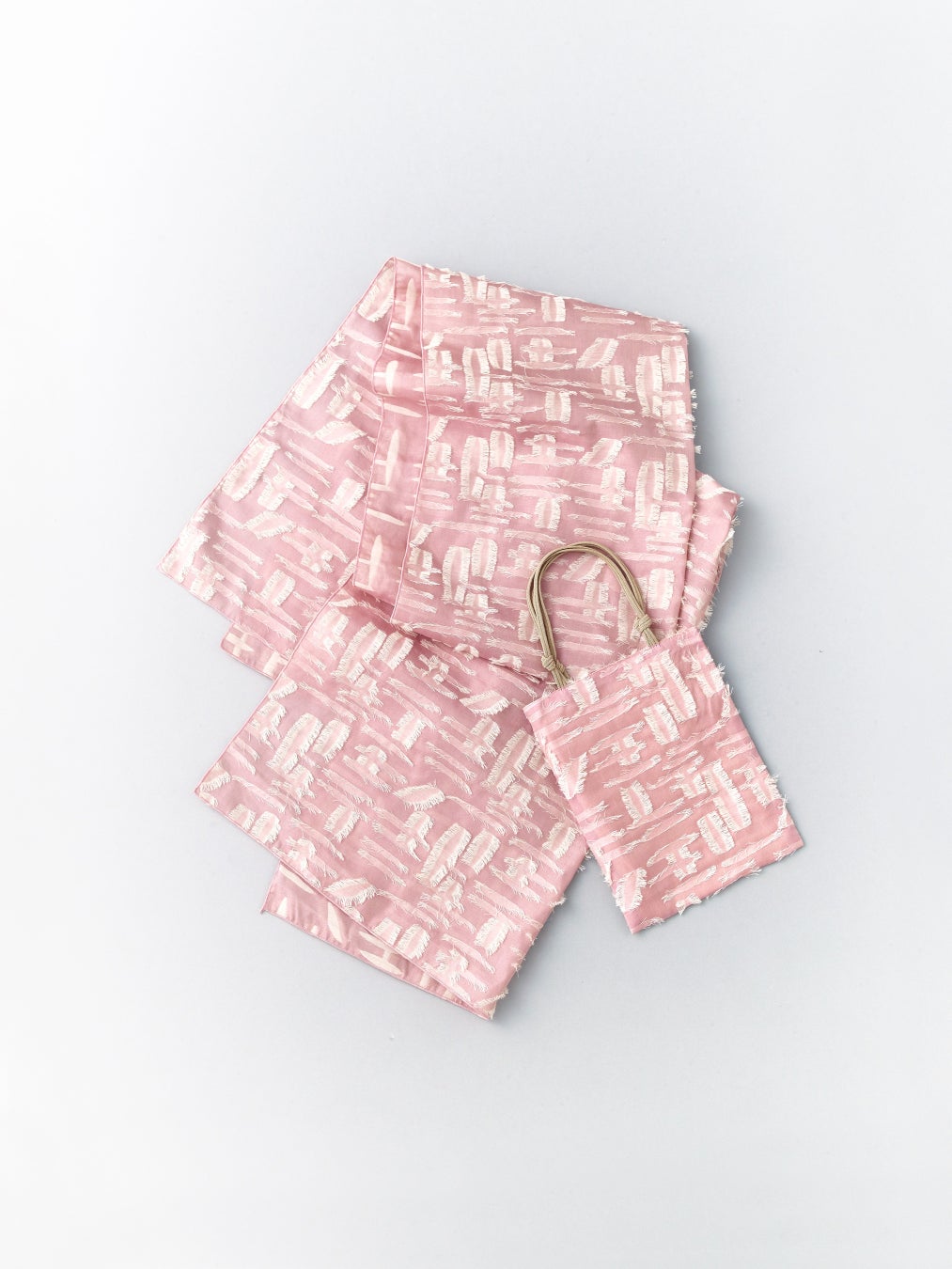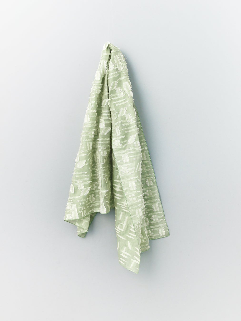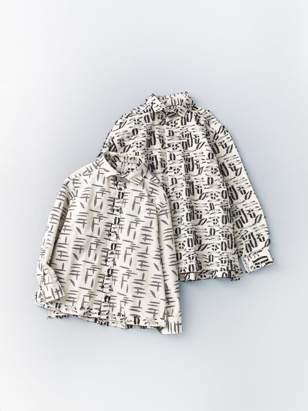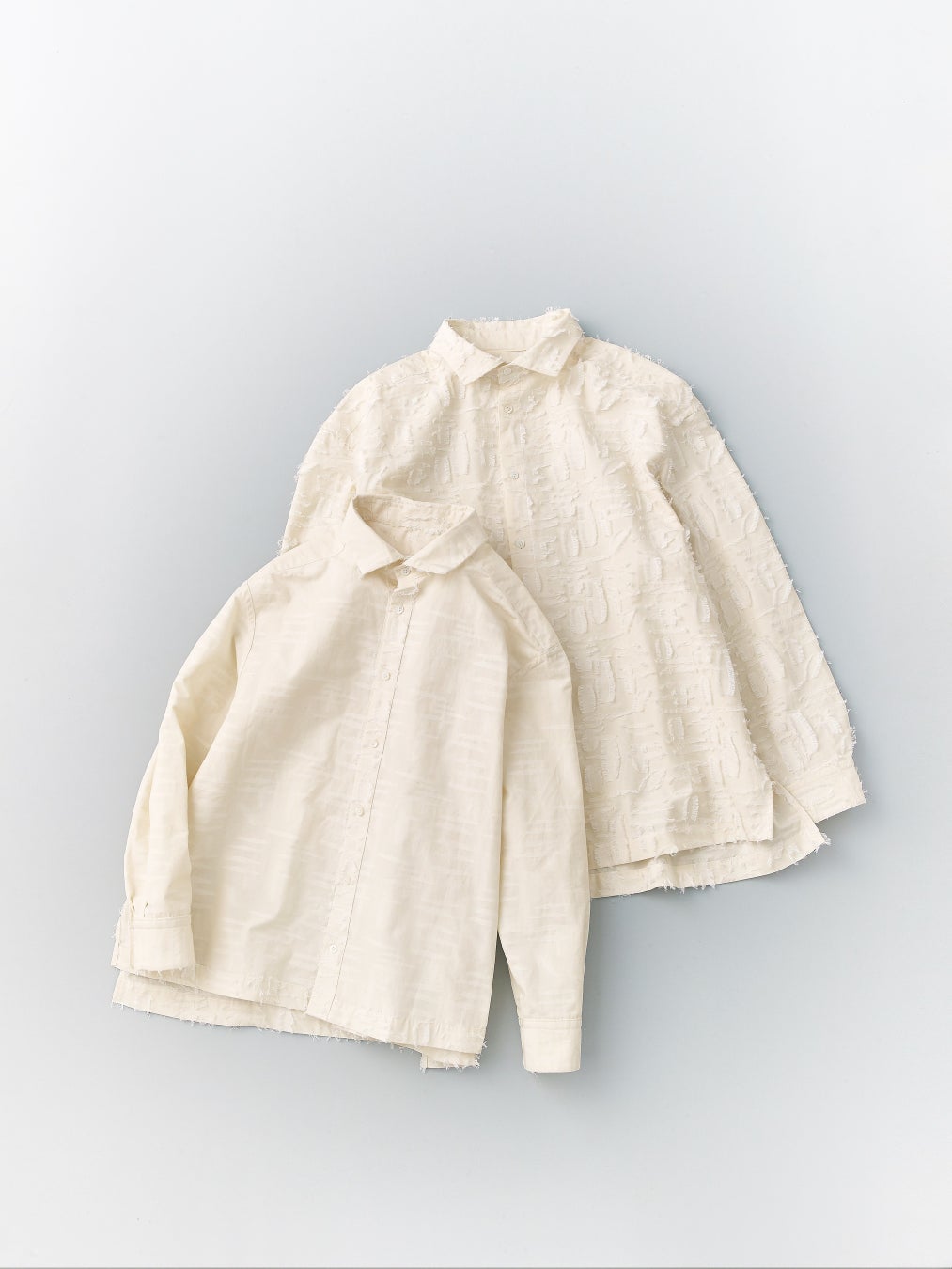 「スカーフやシャツは、裏表のないデザインにしたいということでリバーシブルにしました。シャツに関しては、両サイドにスリットが入っており、羽織としても使えるようにしています。またかなり大き目に作っており、袖を折ることで男女ともに着ることができるようにしています。また、私たちの作ったテキスタイルの考え方がわかるよう、布のつくりが見てもらえるように仕上げました。折り目についても手でカットしていることがわかるようなデザインになっています。」