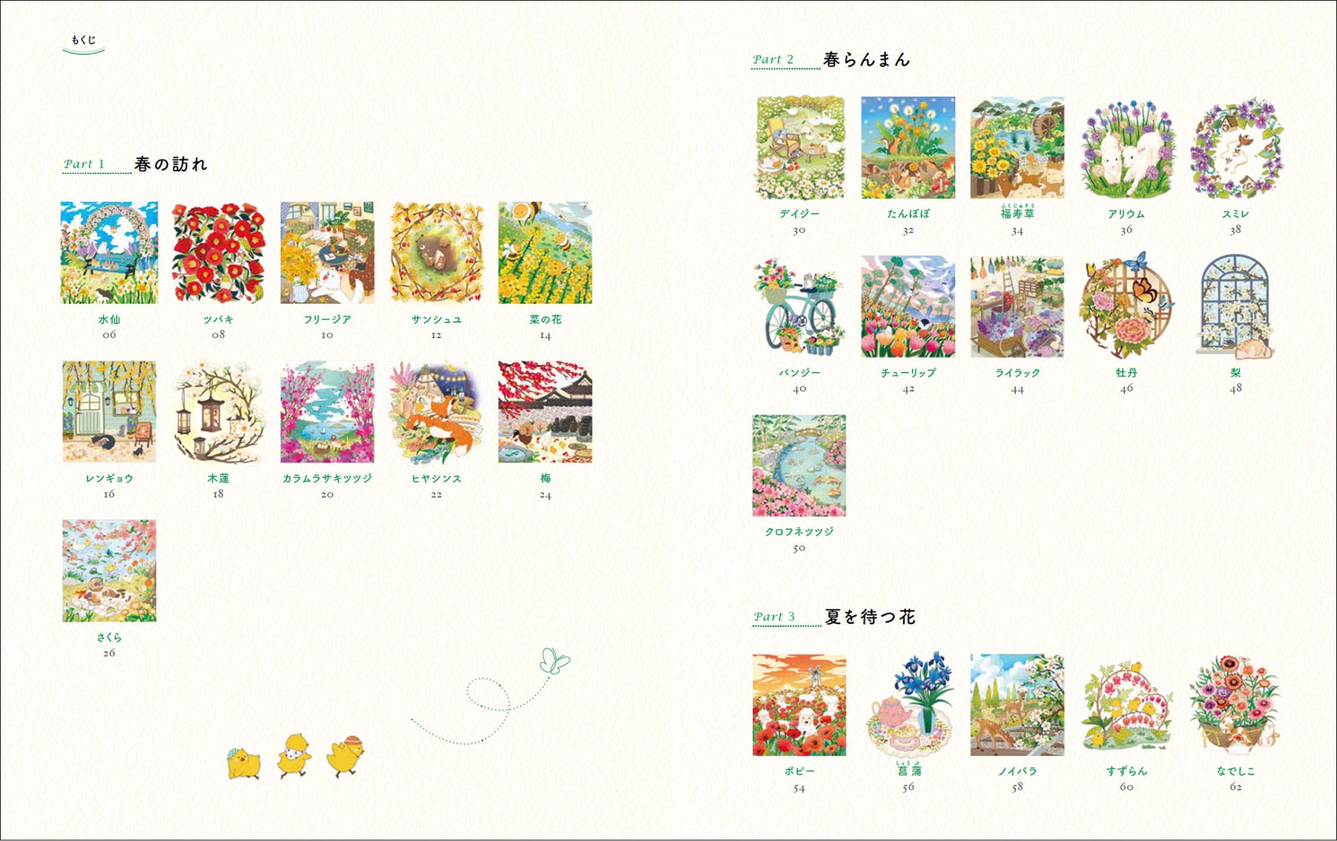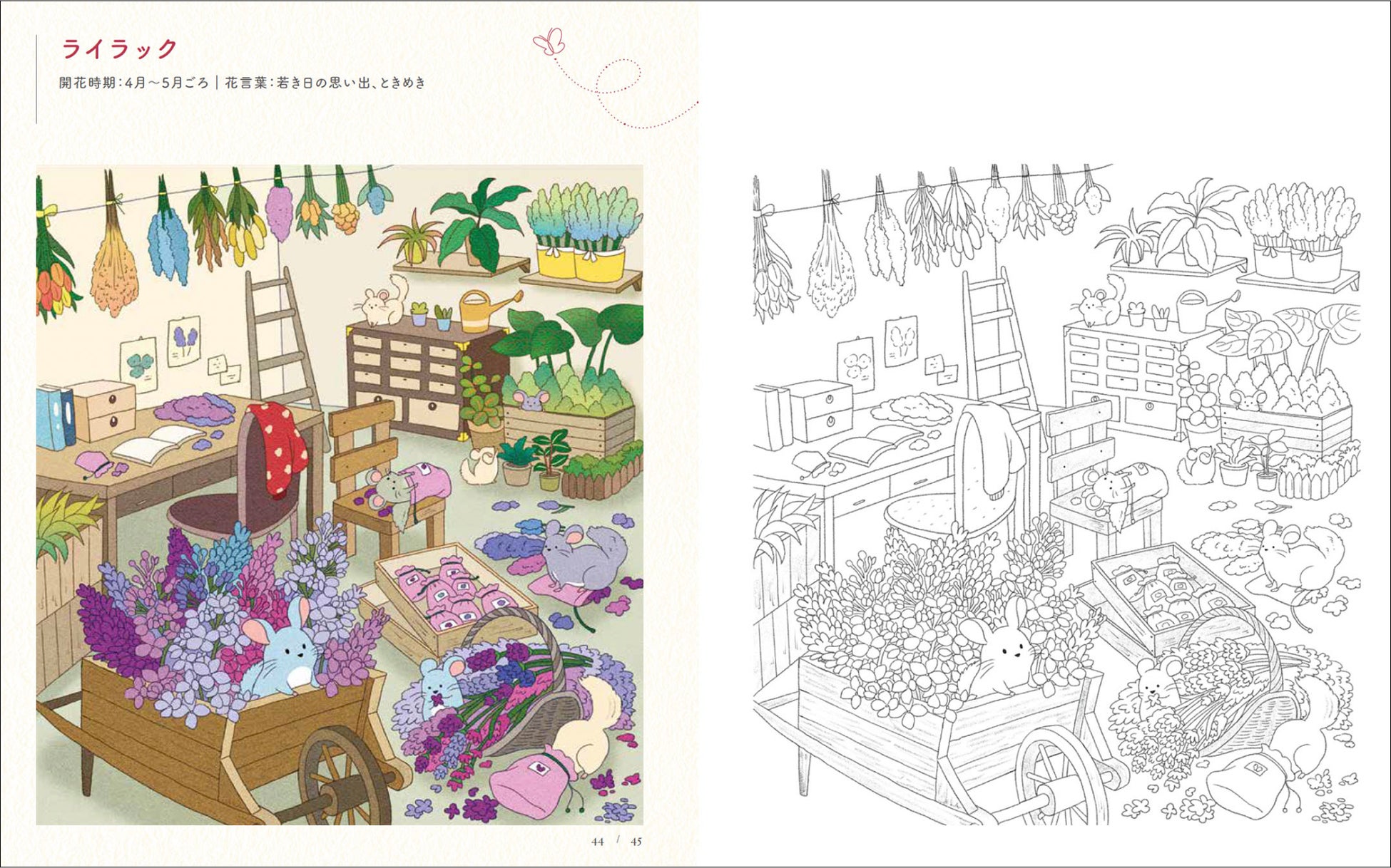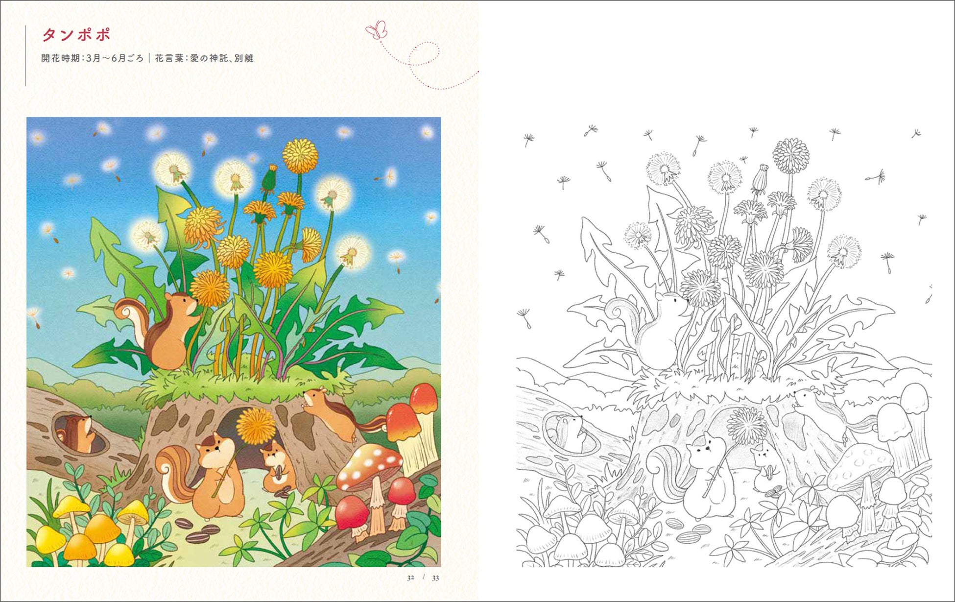 春に美しい姿をみせる27種類の花と、かわいい動物をモチーフにした見本付き塗り絵ブックが登場!