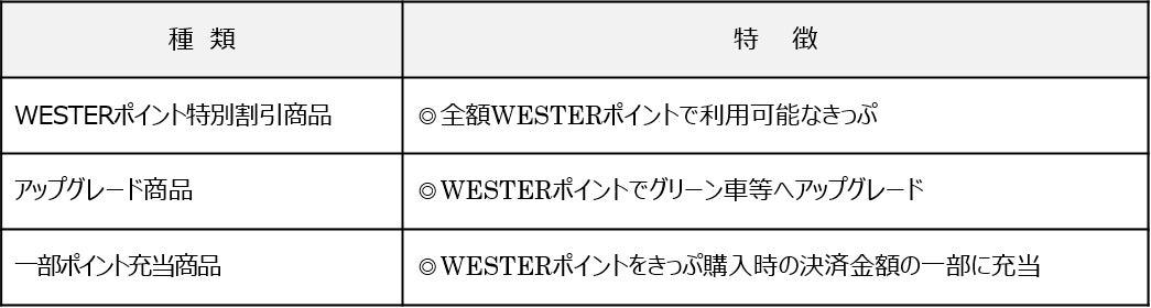 ・たまった「WESTERポイント」は、WESTERポイント特別割引商品(全額ポイント利用)や座席等のアップグレード商品にもご利用いただけます。※ポイント付与や商品の詳細が決まりましたら別途お知らせいたします。
