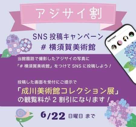 横須賀美術館園路のアジサイを撮影し、SNS(X、Instagram、Facebook、TikTok等)で「#横須賀美術館」をつけて投稿した画面を受付スタッフに提示すると、現在開催中の企画展「成川美術館コレクション展」観覧料が2割引になります。