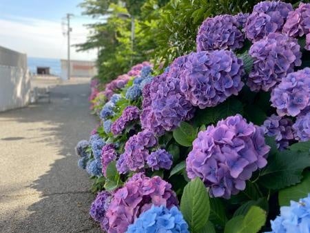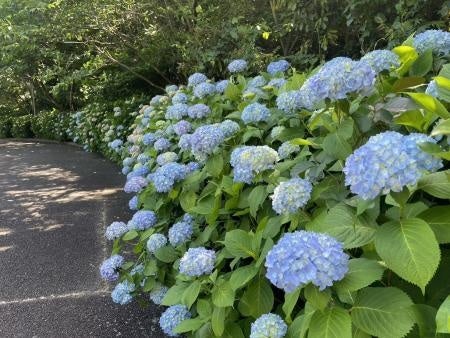 横須賀美術館(横須賀市鴨居4-1)では、例年5月下旬から観音崎公園名物のアジサイ約300株が園路一面に色づき、色とりどりのアジサイやガクアジサイをご覧になれます。約300メートルにわたる園路沿いに美術館を一周するアジサイは、その大部分が、2007年の開館から約3年かけて、美術館職員が一つひとつ挿し木を行い、植え替え、育てたものです。