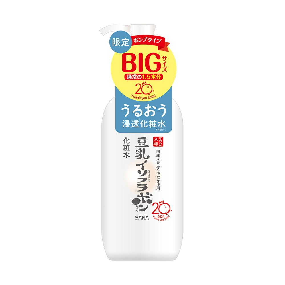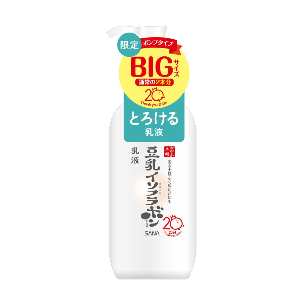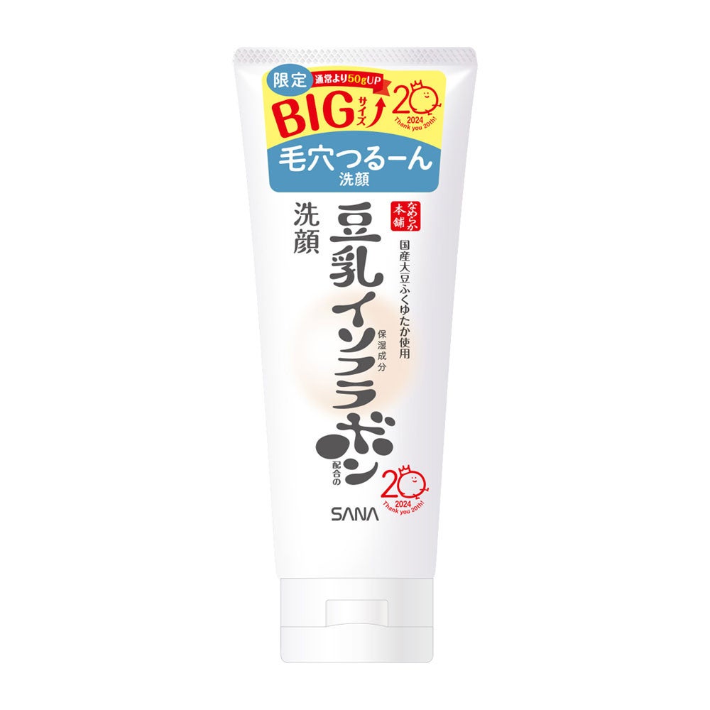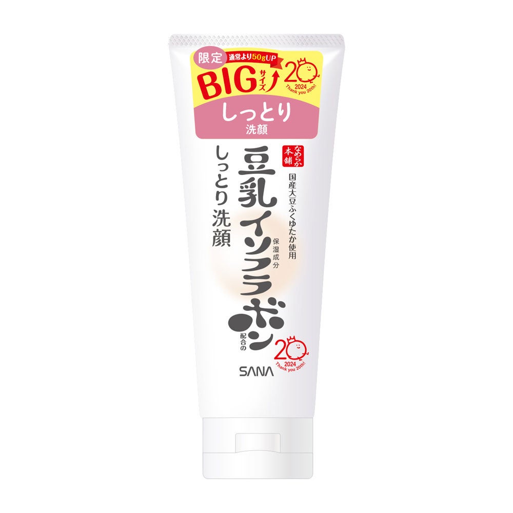 このたびご愛用いただいている皆さまへの感謝の気持ちを込めて、なめらか本舗独自開発の高純度豆乳イソフラボン※1と豆乳発酵液※1を配合した人気アイテムがお得な増量サイズで登場。お値段そのままで、「クレンジング洗顔 NC」「しっとりクレンジング洗顔 NC」は通常より50gUP、「化粧水 NC」は通常の1.5本分、「乳液 NC」は通常の2本分に。なめらか本舗公式キャラクター「ボンちゃん」の20周年記念ロゴ入り限定パッケージで、化粧水と乳液はお客さまからのご要望のお声の多い便利なポンプタイプを採用しました。豆乳の魅力を体感いただける、なめらか本舗20周年を記念した限定アイテムです。
