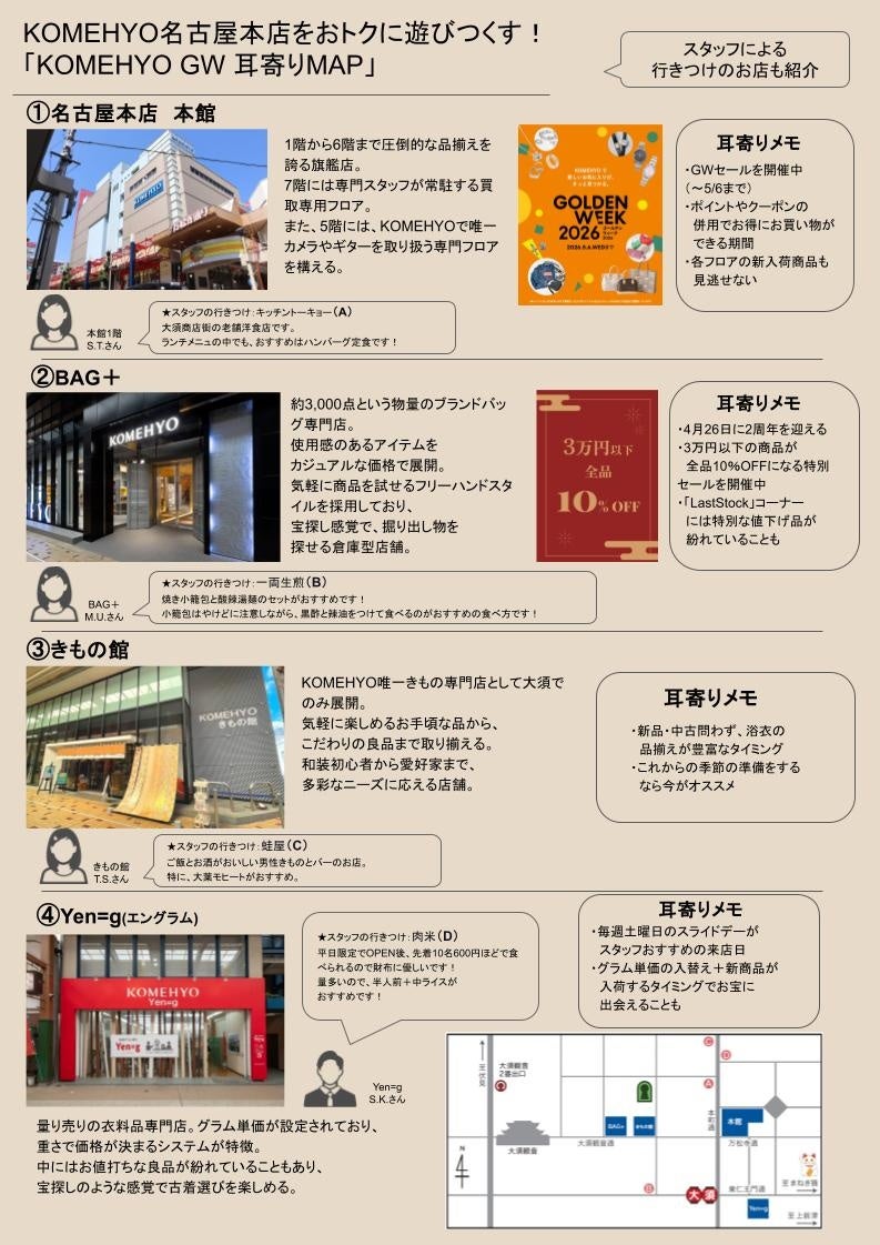株式会社コメ兵(本社所在地:愛知県名古屋市、代表取締役社長:山内 祐也)は、名古屋市、大須にあるKOMEHYO名古屋本店の4つの店舗(名古屋本館、BAG+、きもの館、Yen₌g)のゴールデンウィーク関連情報を1枚に集約した「KOMEHYO GW 耳よりMAP」を制作いたしました。
