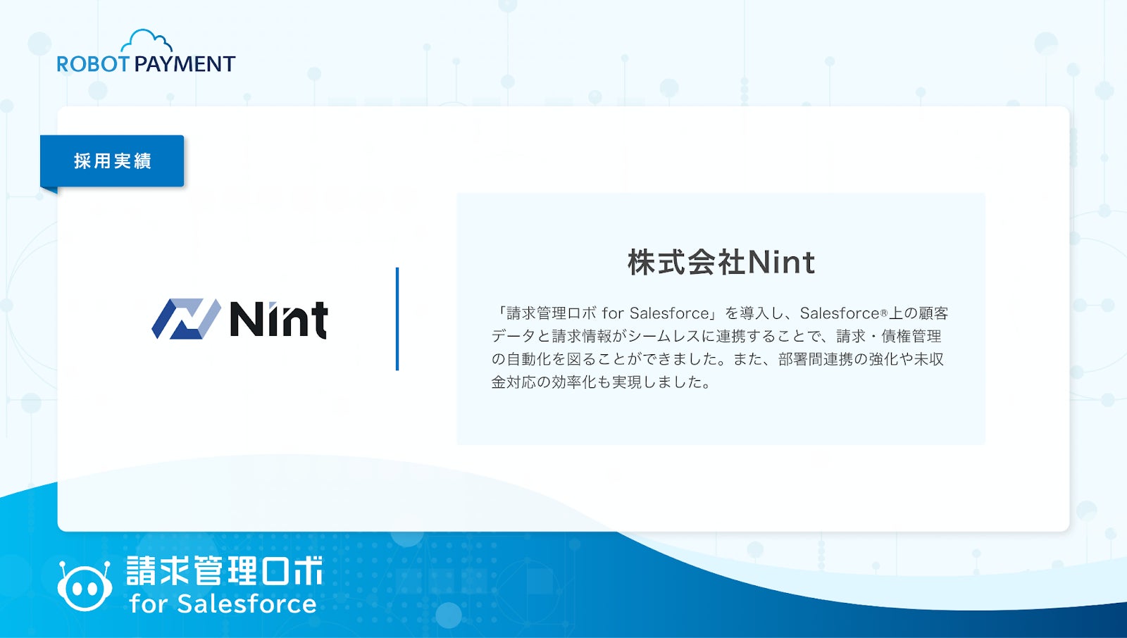国内3大ECモールのデータ分析ツール「Nint ECommerce」を展開する株式会社Nintは、顧客のニーズに合わせた販売・請求モデルを行っています。それゆえ、契約数や支払いタイミング・決済方法などが顧客ごとに異なり、請求管理が煩雑になっていました。「請求管理ロボ for Salesforce」を導入し、Salesforce®上の顧客データと請求情報がシームレスに連携することで、請求・債権管理の自動化を図ることができました。また、部署間連携の強化や未収金対応の効率化も実現しました。