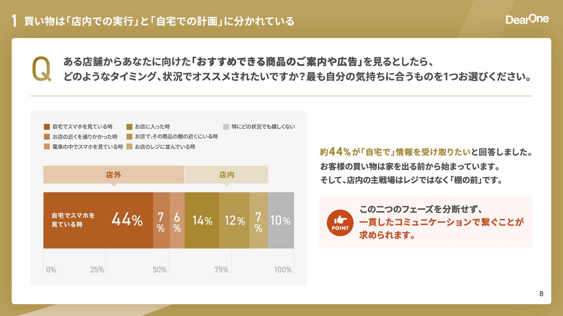 買い物は「自宅での計画」と「店内での実行」に分かれる。情報を受け取りたいタイミングは「自宅」が約44%で最多。