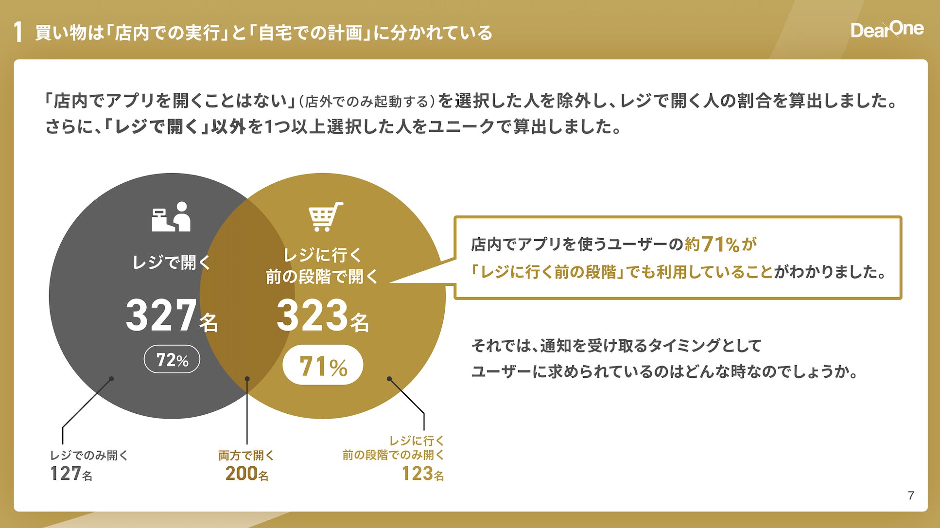 店内でアプリを開くユーザーの約71%が、購買の意思決定が行われる「レジ前の店内」でもアプリを活用している。