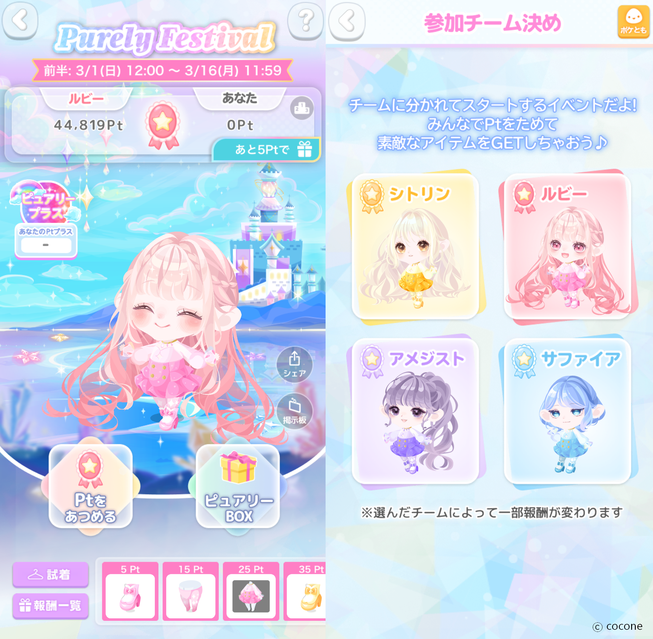 3月1日(日)からはチームに分かれてアイテムを集めるイベント「Purely Festival」がスタート。4つのチームの中から好きなチームを1つ選んで参加し、同じチームのメンバーと協力して「Pt」を貯めることで各チームをイメージした特別なアイテムが手に入ります。