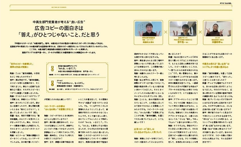 また、中高生部門では審査員長の阿部広太郎氏をモデレーターに座談会を行いました。どのような気持ちでコピーを考えたのか。“良い広告”とは何か。前回グランプリ受賞者・ゴールド受賞者2名に話を聞きました。