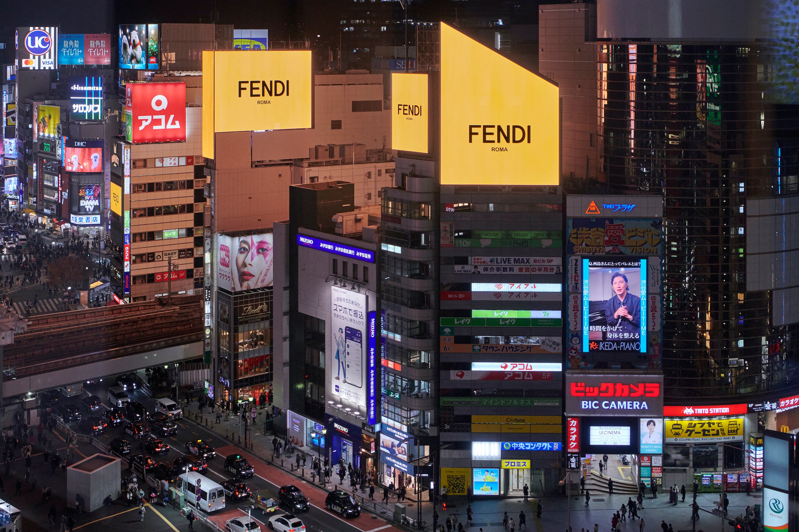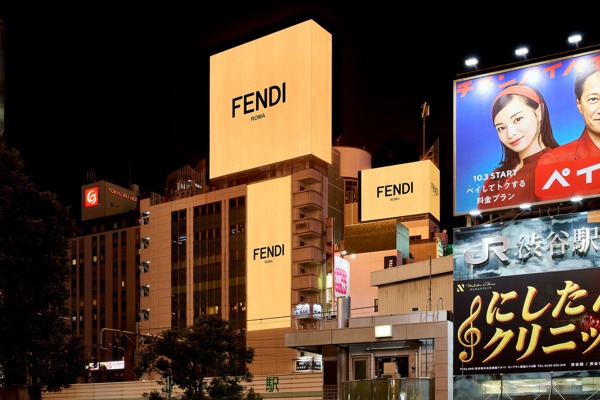 さらに、フェンディが本拠を置く永遠の都・ローマを染める夕日からインスピレーションを得たフェンディ イエローとアイコニックな「FENDI ROMA(フェンディ ローマ)」ロゴのフラッグが、イルミネーションと並行して表参道のメインストリートを飾るとともに、東京のランドマークともいえる渋谷のスクランブル交差点のビジョンと、東京メトロ銀座線のレトロライナーをジャックします。