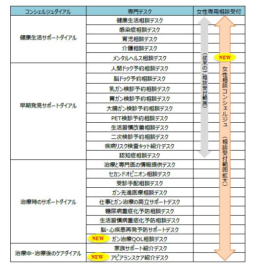 全 26 の専門デスクの内容をすべてカバーし、包括的に細やかなサポートを提供できるようにしまし た。(別紙ご参照) 日々のくらしの中での育児や介護などのサポートから、乳がんなどの検診相談・ 予約手配サービス、そして今回新設した「ガン治療 QOL 相談デスク」の内容を含む治療時のサポー ト、「アピアランスケア紹介デスク」の内容を含む治療中・治療後のケアに関することまで、女性相談 コンシェルジュだけで様々なご相談をしていただくことができるようになりました。なお、女性特有の お悩みに寄り添えるように、女性のヘルスカウンセラーが対応いたします。