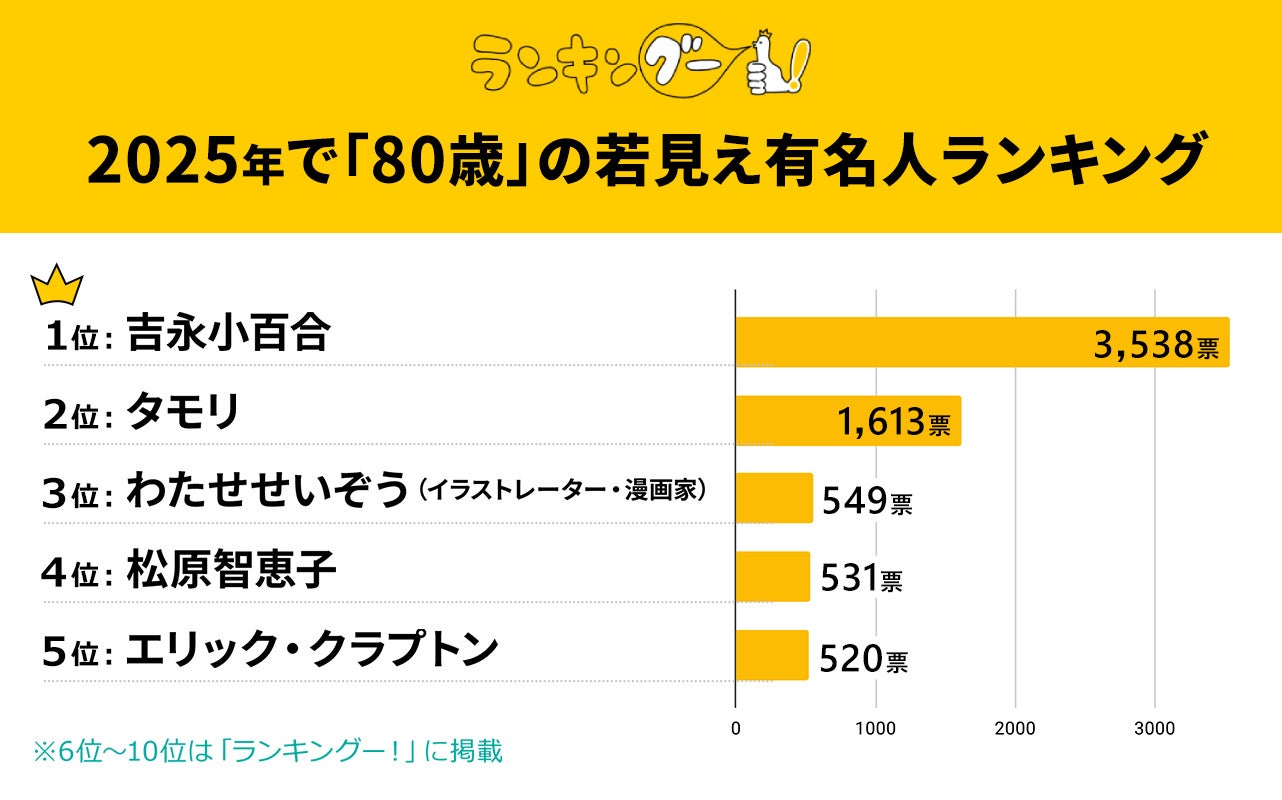 ランキングー!では2025年で「80歳」の若見え有名人をピックアップし、ランキングを調査。全年代の男女(性別回答しないを含む)9,656名にアンケートを行い、TOP10を決定しました。ここではTOP5をご紹介します。
