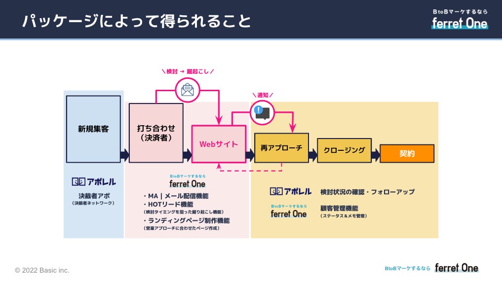 オールインワン型BtoBマーケティングツール『ferret One』を運営する株式会社ベーシック(代表者:秋山勝 本社:東京都千代田区、以下「当社」)と決裁者アポイント獲得支援SaaS「アポレル」を運営する株式会社アライアンスクラウド(代表者:宮崎翔太 本社:東京都目黒区)は、業務提携することをお知らせいたします。
