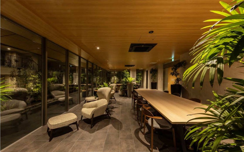 本物件では、京都府の分譲マンションで初めて、グリーンラウンジ内に株式会社日比谷花壇※1監修のバイオフィリックデザインを導入いたします。バイオフィリックデザインとは、生命や自然とのつながりを重視し、建築物に自然の景観、天然素材、観葉植物などを取り入れることで、ストレスの緩和やマインドフルネスといった健康に導く効果、癒しや安らぎを与えるフィトンチッド効果、集中力の向上効果があると期待されており、近年欧米を中心に注目が高まっています。中庭(オーナーズガーデン)の植栽をガラス越しに臨むラウンジ内にも、バイオフィリックデザインに基づいた木々を配し、『ラウンジに居ながらにして、まるで森の中で、寛ぎ/集中してテレワークができ/読書に没頭できる場所』を作ります。