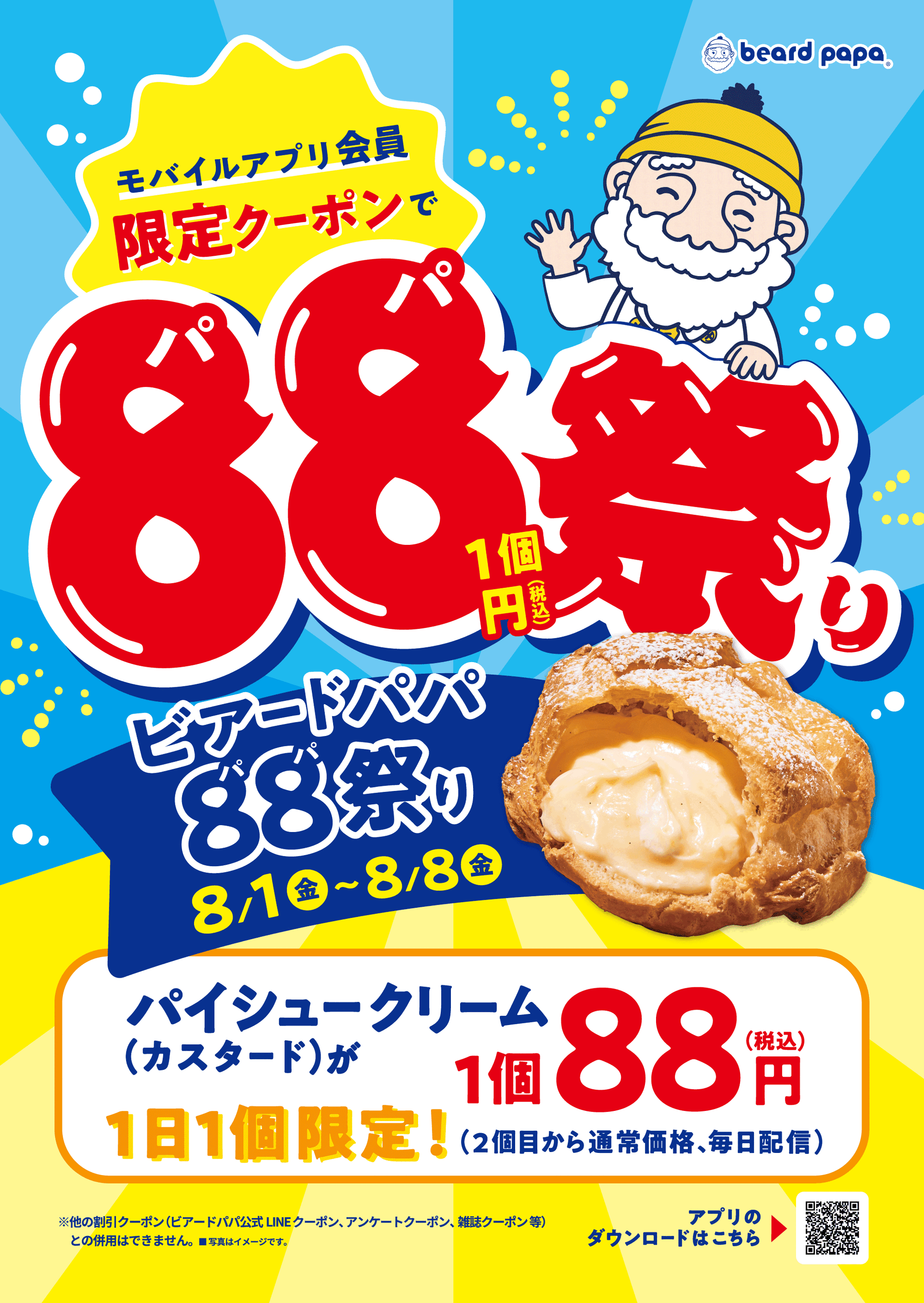 【8/1~8/8まで】アプリをお持ちのお客様は“パイシュークリーム(カスタード)”が1個88円!さらにお祭りを盛り上げる“#ビアードパパ88祭り写真投稿キャンペーン”も開催