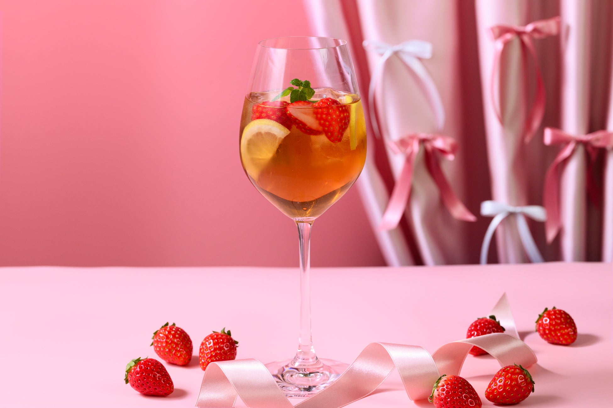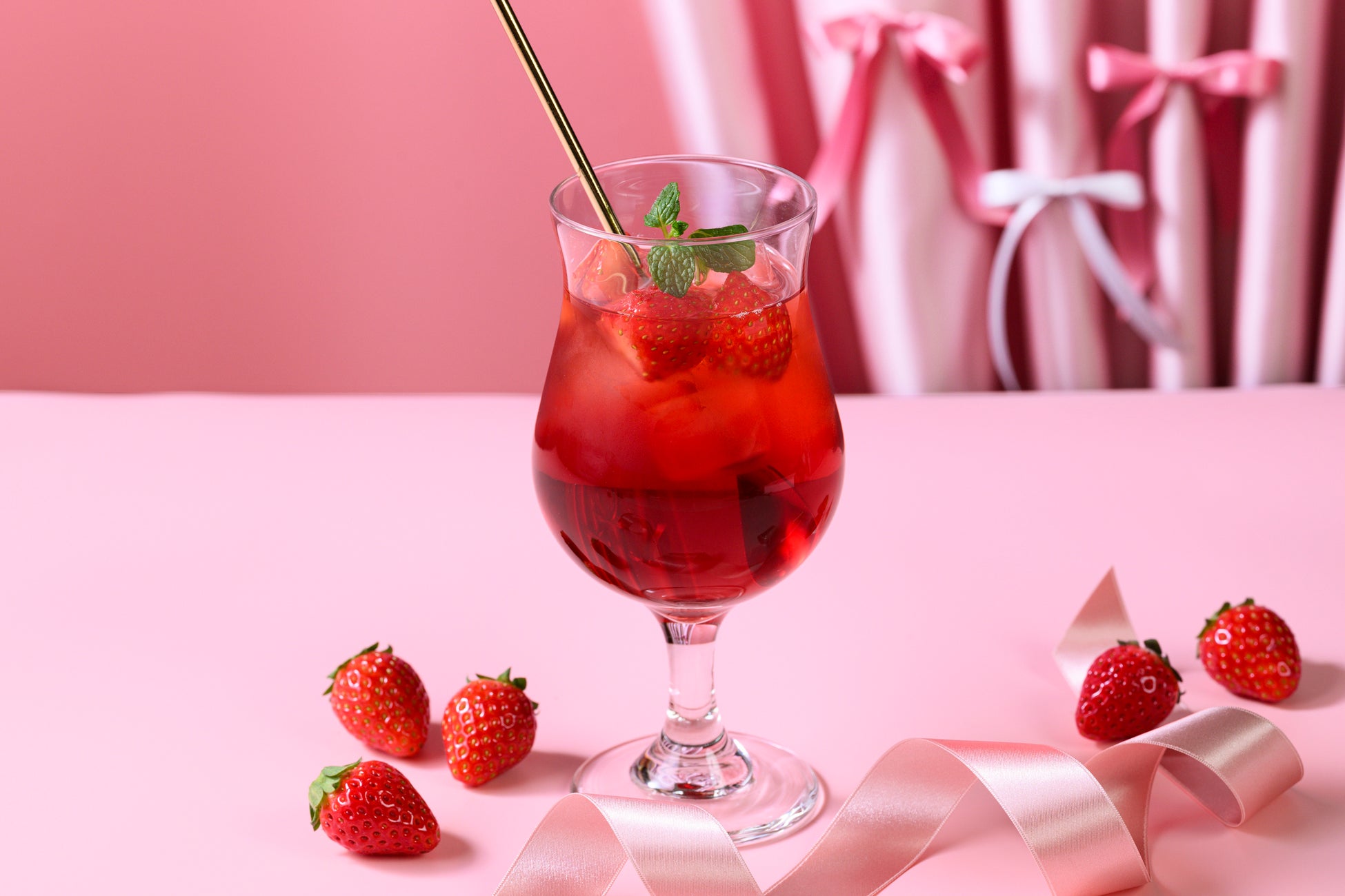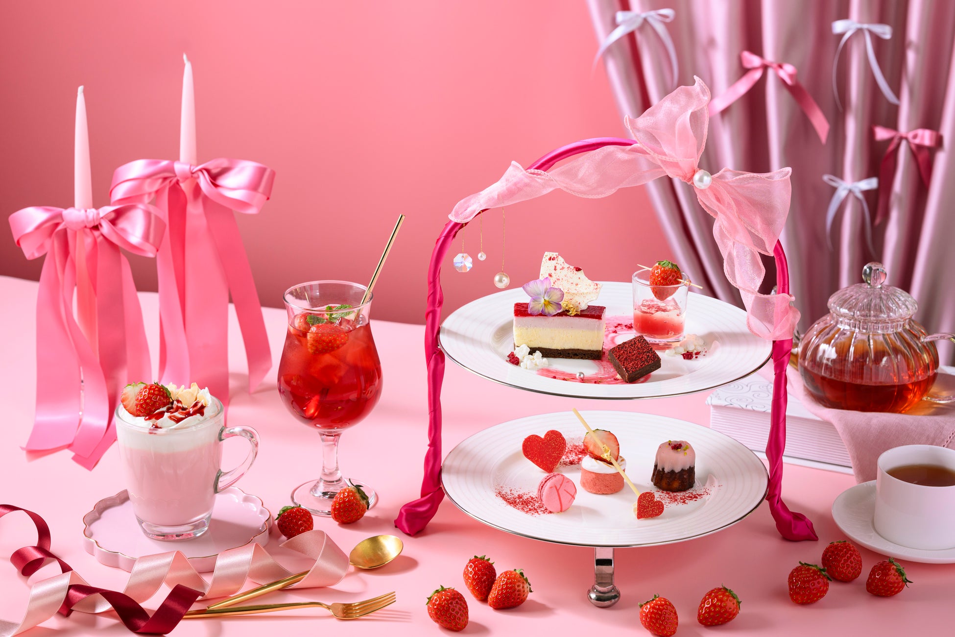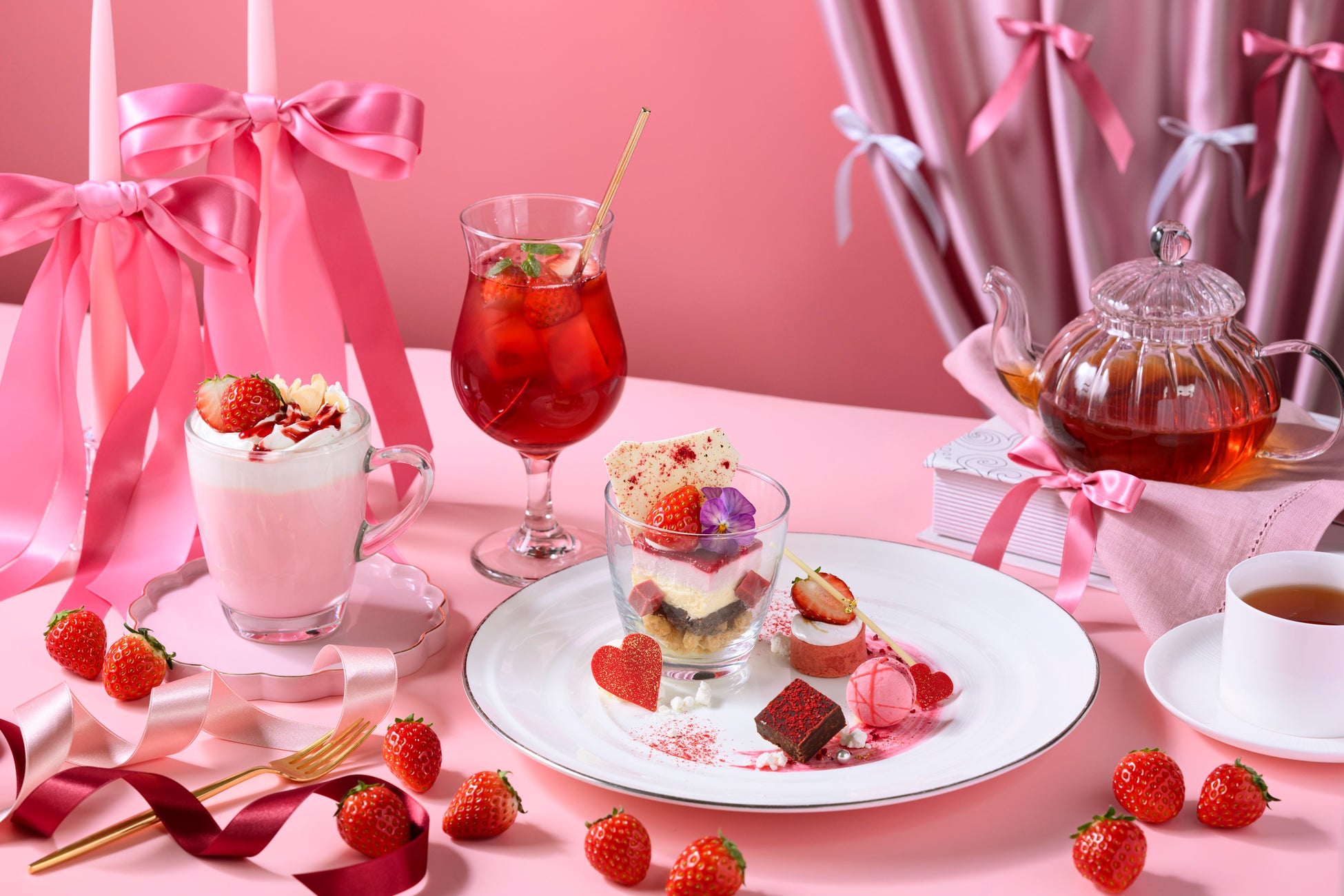 色鮮やかな苺のフルーツティーやハーブティー、心温まるホットドリンクや、爽やかな苺の甘さを感じるカクテル等、この時季にしか味わえないドリンクをご用意。