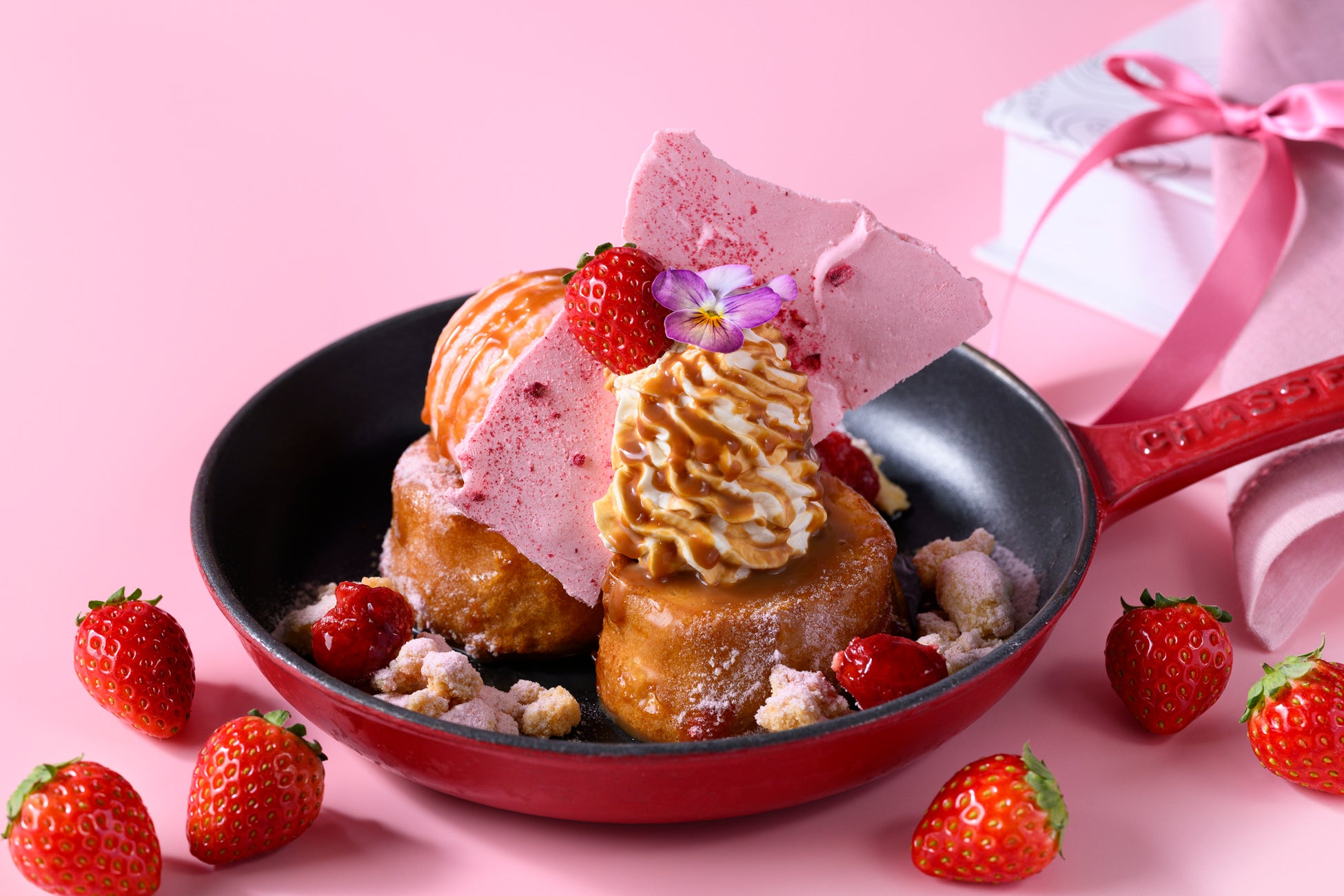 熱々のパンペルデュに苺アイスと濃厚なマスカルポーネのクリームを乗せ、甘酸っぱい苺ジャムとキャラメルソースをトッピングしました。ピンク色と赤色を基調に仕上げた、見た目も可愛らしい一品です。