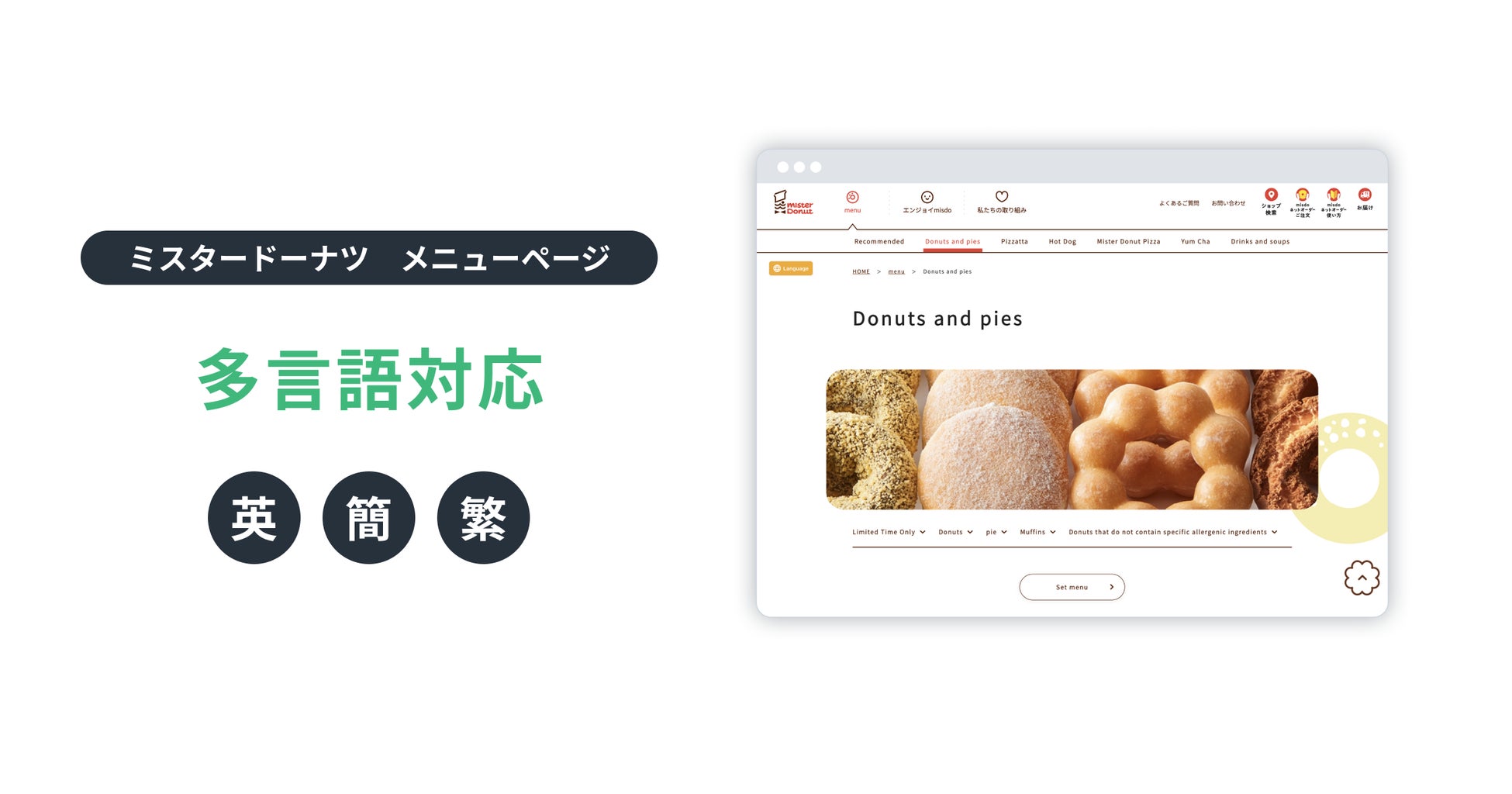 ミスタードーナツ公式サイト内メニューページ(おすすめページを除く)を、WOVN.io で英語、簡体字、繁体字に対応しています。