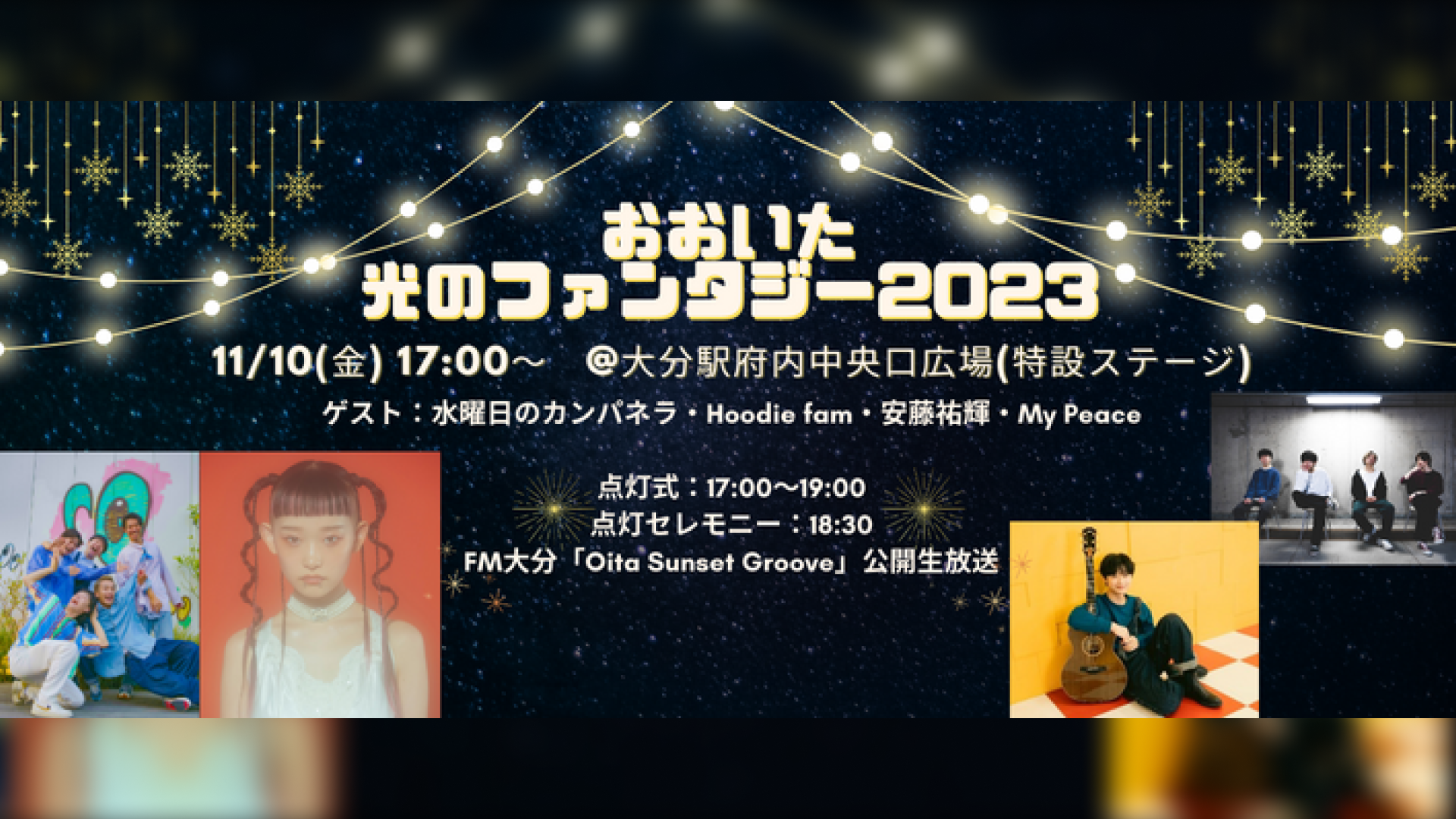 TiKTok・YouTube Shortを中心に、オリジナルのダンスなど愉快な動画を投稿する5人組のダンスクリエイター「Hoodie fam」(Star Creation所属)が、11⽉10⽇(金)に大分駅前広場(大屋根下特設ステージ)で行われた「おおいた光のファンタジー2023点灯式~星たちよ 花となって降りそそげ~」の点灯式に出演いたしました。