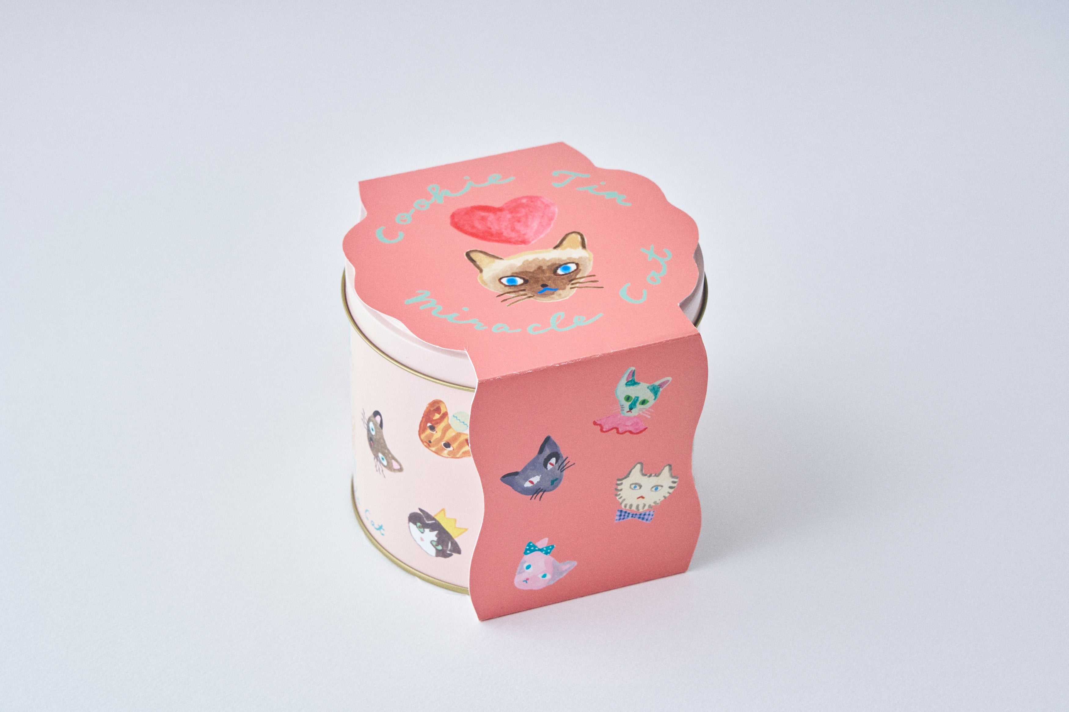 「Miracle Cat Cookie Tin(“神様のいたずら”ネコクッキー缶)」は、“神様のいたずら”のような、不思議な模様やユニークな特徴をもつミラクルキャットたちの愛おしさを伝えたくてうまれたお菓子。ミュージシャン・坂本美雨さん、イラストレーター・前田ひさえさん、フェアリーケーキフェアとの共同制作によって2021年にデビューした大人気のネコクッキー缶です。
