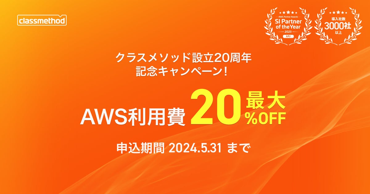 AWS利用費が6月末まで最大20%オフ! クラスメソッド設立20周年記念キャンペーン開催