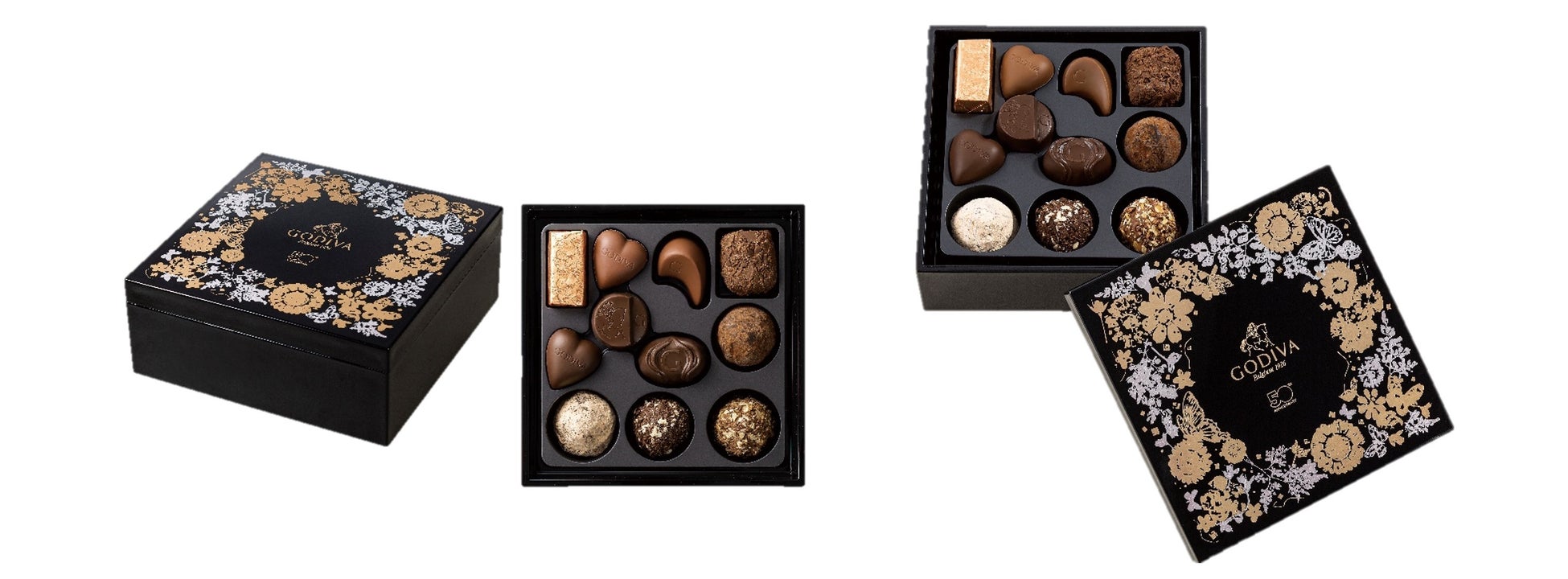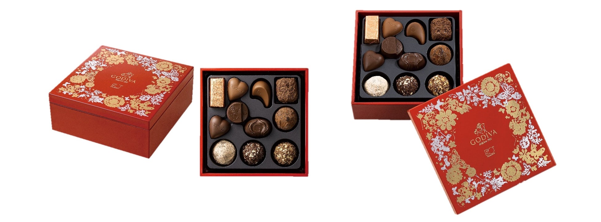 日本への感謝の気持ちを込めて今年お届けしてきた50周年を記念するコレクションを締めくくる「50周年 アニバーサリー -秋冬-」コレクションから、山田平安堂謹製のお重に、ゴディバ創業者ドラップスの秘伝のトリュフやゴディバと日本の歴史をたどるチョコレートを詰め合わせた「50周年 アニバーサリー -秋冬- スイーツおせち」が登場します。